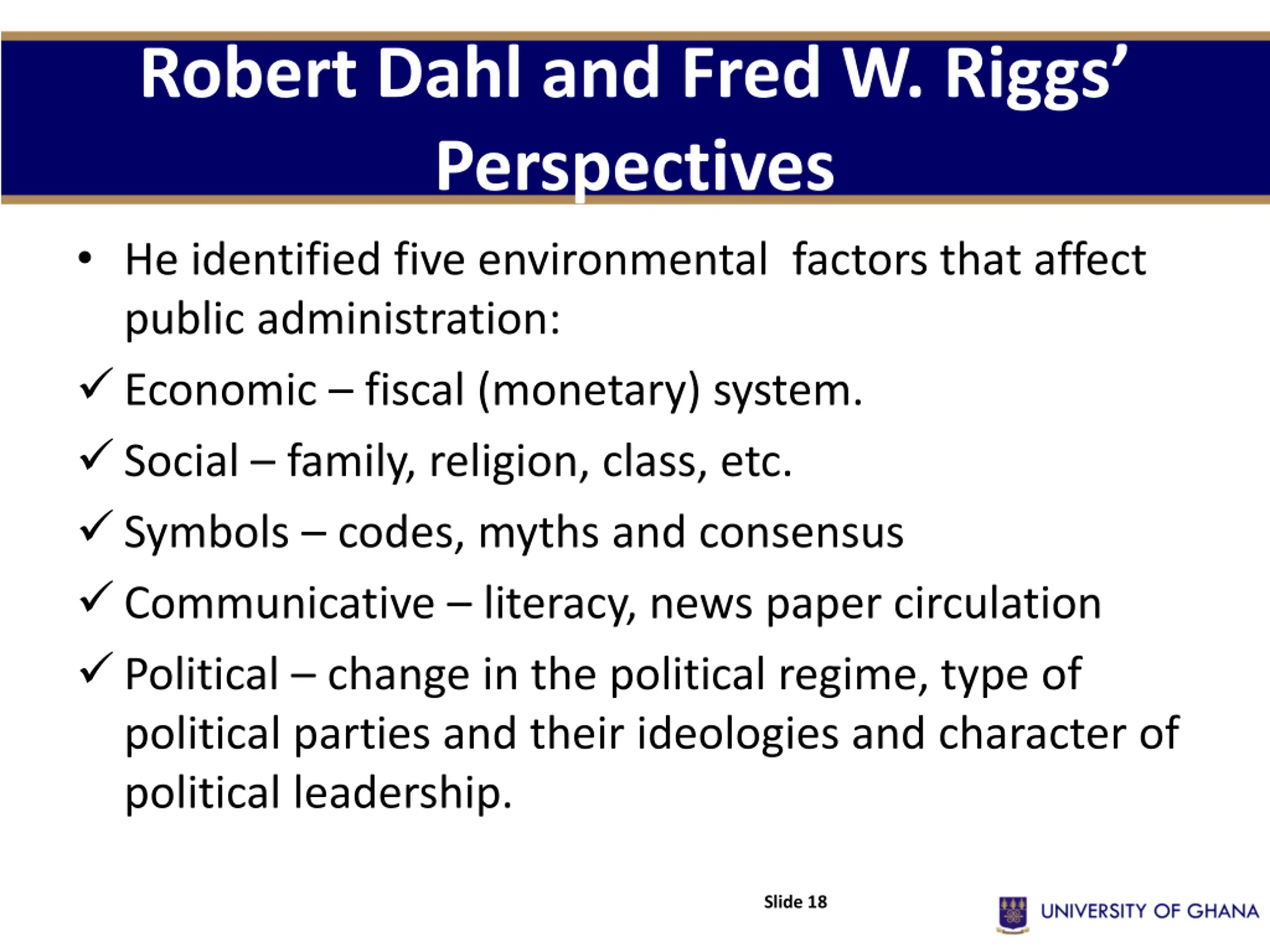Robert Dahl and Fred W. Riggs Perspectives He identified five environmental factors that affect public administration: Economic fiscal (monetary) system. Social family, religion, class, etc. Symbols codes, myths and consensus Communicative literacy, news paper circulation Political change in the political regime, type of political parties and their ideologies and character of political leadership. Slide 18