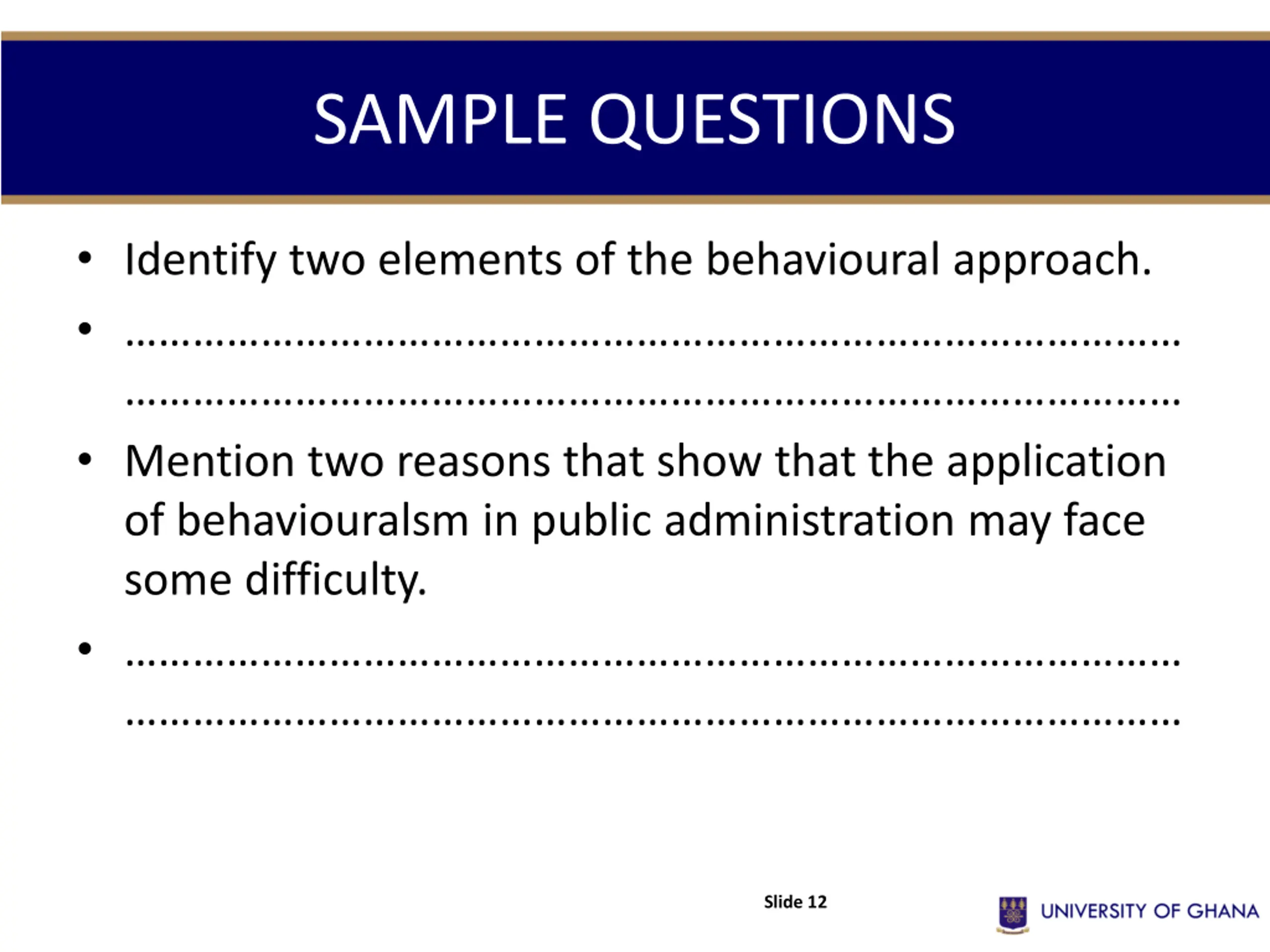 SAMPLE QUESTIONS Identify two elements of the behavioural approach. Mention two reasons that show that the application of behaviouralsm in public administration may face some difficulty. Slide 12