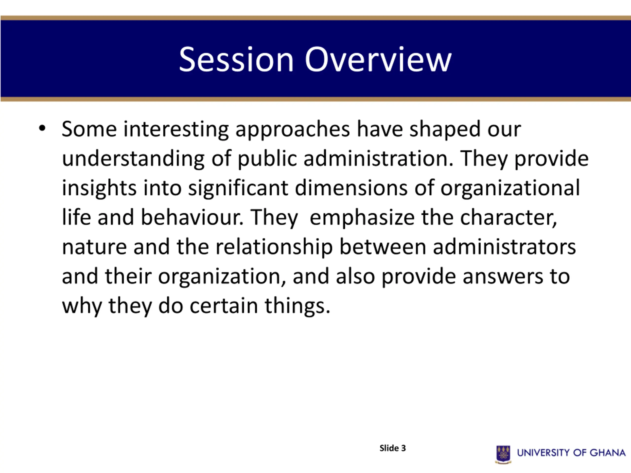 Session Overview Some interesting approaches have shaped our understanding of public administration. They provide insights into significant dimensions of organizational life and behaviour. They emphasize the character, nature and the relationship between administrators and their organization, and also provide answers to why they do certain things. Slide 3