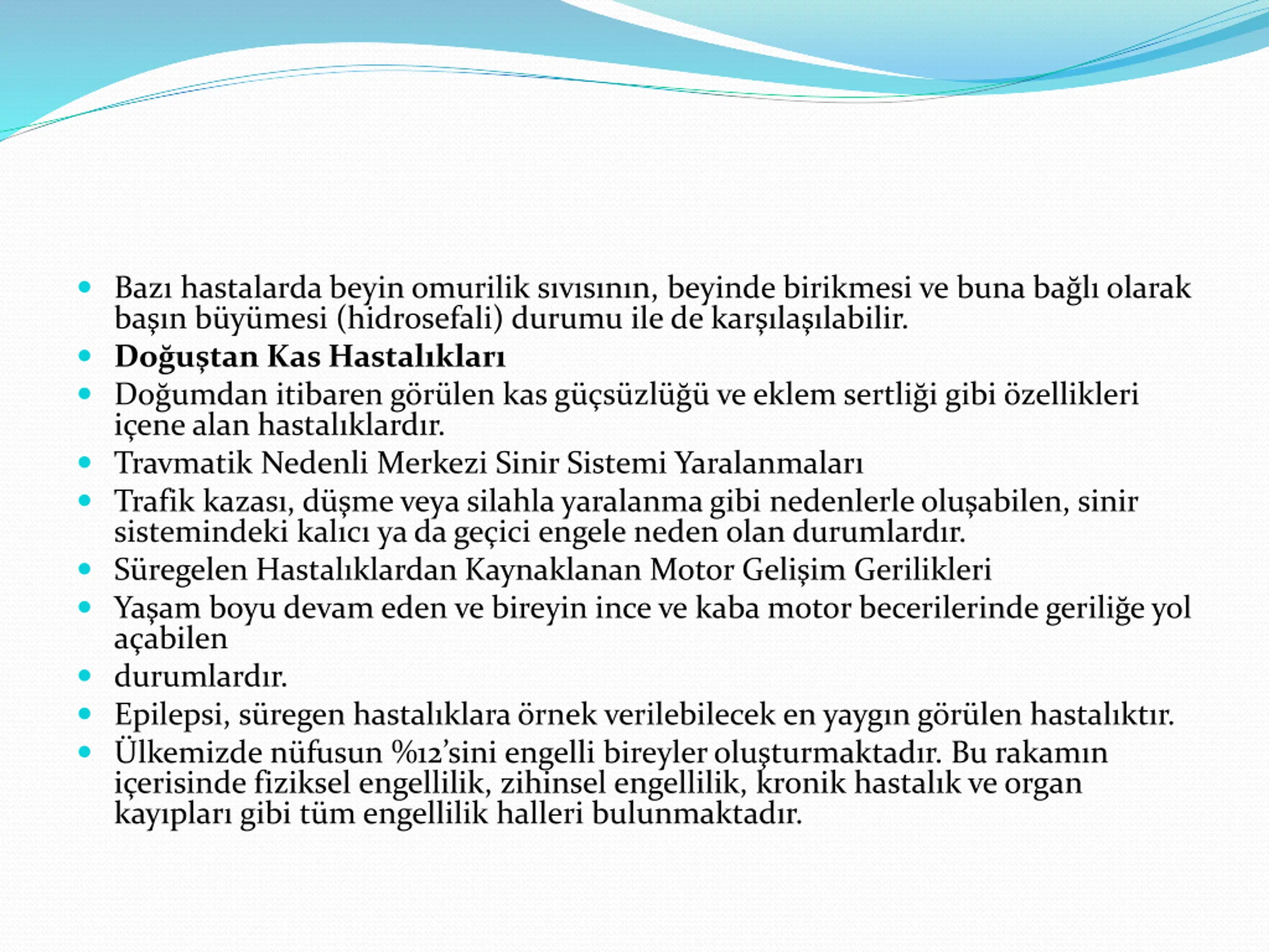 Baz hastalarda beyin omurilik svsnn, beyinde birikmesi ve buna bal olarak ba n b y mesi (hidrosefali) durumu ile de kar la labilir. Do u tan Kas Hastal klar Do umdan itibaren g r len kas g s zl ve eklem sertli i gibi zellikleri i ene alan hastal klard r. Travmatik Nedenli Merkezi Sinir Sistemi Yaralanmalar Trafik kazas , d me veya silahla yaralanma gibi nedenlerle olu abilen, sinir sistemindeki kal c ya da ge ici engele neden olan durumlard r. S regelen Hastal klardan Kaynaklanan Motor Geli im Gerilikleri Ya am boyu devam eden ve bireyin ince ve kaba motor becerilerinde gerili e yol a abilen durumlard r. Epilepsi, s regen hastal klara rnek verilebilecek en yayg n g r len hastal kt r. lkemizde n fusun %12 sini engelli bireyler olu turmaktad r. Bu rakam n i erisinde fiziksel engellilik, zihinsel engellilik, kronik hastal k ve organ kay plar gibi t m engellilik halleri bulunmaktad r.