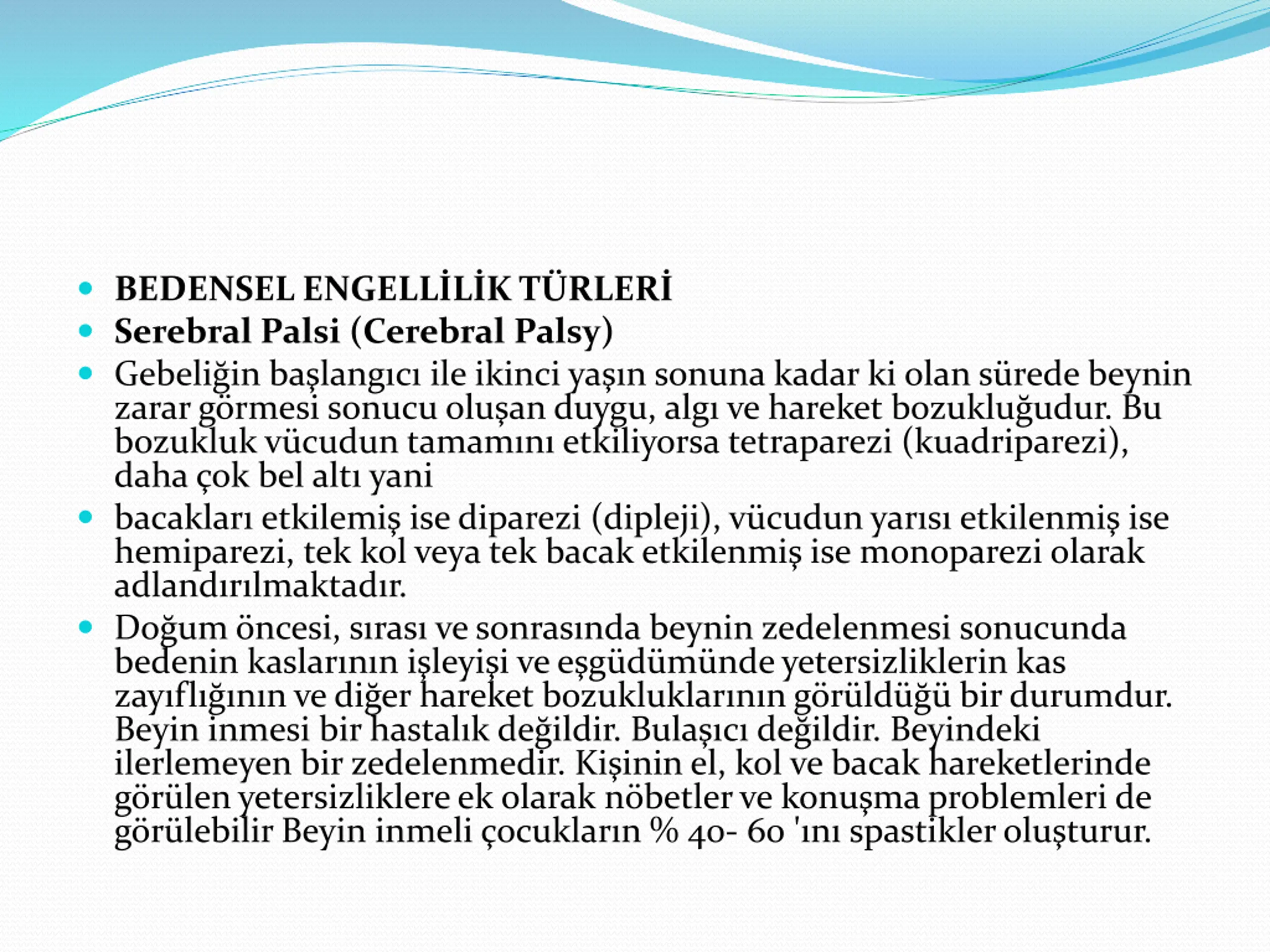 BEDENSEL ENGELLLK TRLER Serebral Palsi (Cerebral Palsy) Gebeli in ba lang c ile ikinci ya n sonuna kadar ki olan s rede beynin zarar g rmesi sonucu olu an duygu, alg ve hareket bozuklu udur. Bu bozukluk v cudun tamam n etkiliyorsa tetraparezi (kuadriparezi), daha ok bel alt yani bacaklar etkilemi ise diparezi (dipleji), v cudun yar s etkilenmi ise hemiparezi, tek kol veya tek bacak etkilenmi ise monoparezi olarak adland r lmaktad r. Do um ncesi, s ras ve sonras nda beynin zedelenmesi sonucunda bedenin kaslar n n i leyi i ve e g d m nde yetersizliklerin kas zay fl n n ve di er hareket bozukluklar n n g r ld bir durumdur. Beyin inmesi bir hastal k de ildir. Bula c de ildir. Beyindeki ilerlemeyen bir zedelenmedir. Ki inin el, kol ve bacak hareketlerinde g r len yetersizliklere ek olarak n betler ve konu ma problemleri de g r lebilir Beyin inmeli ocuklar n % 40- 60 ' n spastikler olu turur.