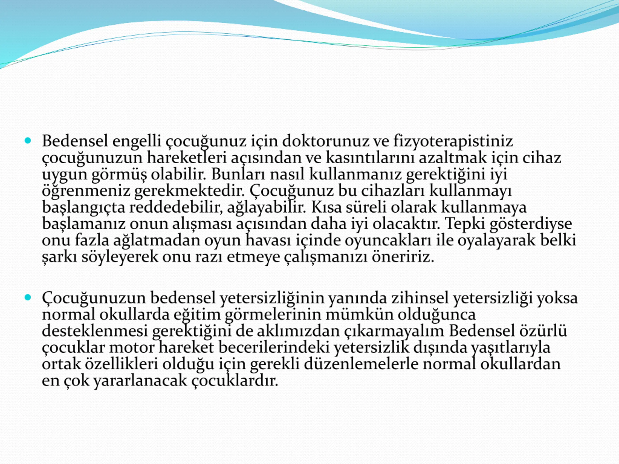 Bedensel engelli ocuunuz iin doktorunuz ve fizyoterapistiniz ocu unuzun hareketleri a s ndan ve kas nt lar n azaltmak i in cihaz uygun g rm olabilir. Bunlar nas l kullanman z gerekti ini iyi renmeniz gerekmektedir. ocu unuz bu cihazlar kullanmay ba lang ta reddedebilir, a layabilir. K sa s reli olarak kullanmaya ba laman z onun al mas a s ndan daha iyi olacakt r. Tepki g sterdiyse onu fazla a latmadan oyun havas i inde oyuncaklar ile oyalayarak belki ark s yleyerek onu raz etmeye al man z neririz. ocu unuzun bedensel yetersizli inin yan nda zihinsel yetersizli i yoksa normal okullarda e itim g rmelerinin m mk n oldu unca desteklenmesi gerekti ini de akl m zdan karmayal m Bedensel z rl ocuklar motor hareket becerilerindeki yetersizlik d nda ya tlar yla ortak zellikleri oldu u i in gerekli d zenlemelerle normal okullardan en ok yararlanacak ocuklard r.