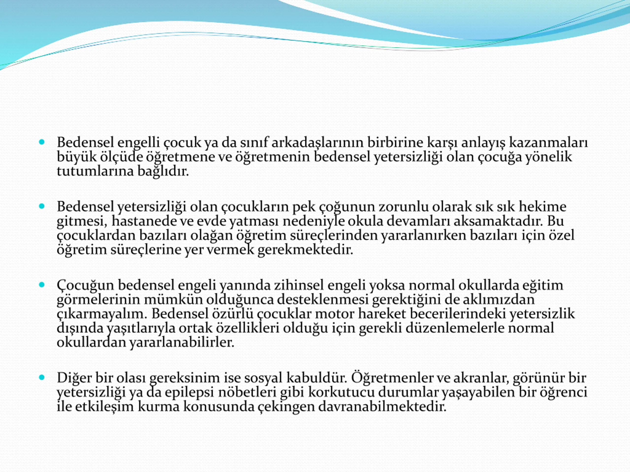 Bedensel engelli ocuk ya da snf arkadalarnn birbirine kar anlay kazanmalar b y k l de retmene ve retmenin bedensel yetersizli i olan ocu a y nelik tutumlar na ba l d r. Bedensel yetersizli i olan ocuklar n pek o unun zorunlu olarak s k s k hekime gitmesi, hastanede ve evde yatmas nedeniyle okula devamlar aksamaktad r. Bu ocuklardan baz lar ola an retim s re lerinden yararlan rken baz lar i in zel retim s re lerine yer vermek gerekmektedir. ocu un bedensel engeli yan nda zihinsel engeli yoksa normal okullarda e itim g rmelerinin m mk n oldu unca desteklenmesi gerekti ini de akl m zdan karmayal m. Bedensel z rl ocuklar motor hareket becerilerindeki yetersizlik d nda ya tlar yla ortak zellikleri oldu u i in gerekli d zenlemelerle normal okullardan yararlanabilirler. Di er bir olas gereksinim ise sosyal kabuld r. retmenler ve akranlar, g r n r bir yetersizli i ya da epilepsi n betleri gibi korkutucu durumlar ya ayabilen bir renci ile etkile im kurma konusunda ekingen davranabilmektedir.