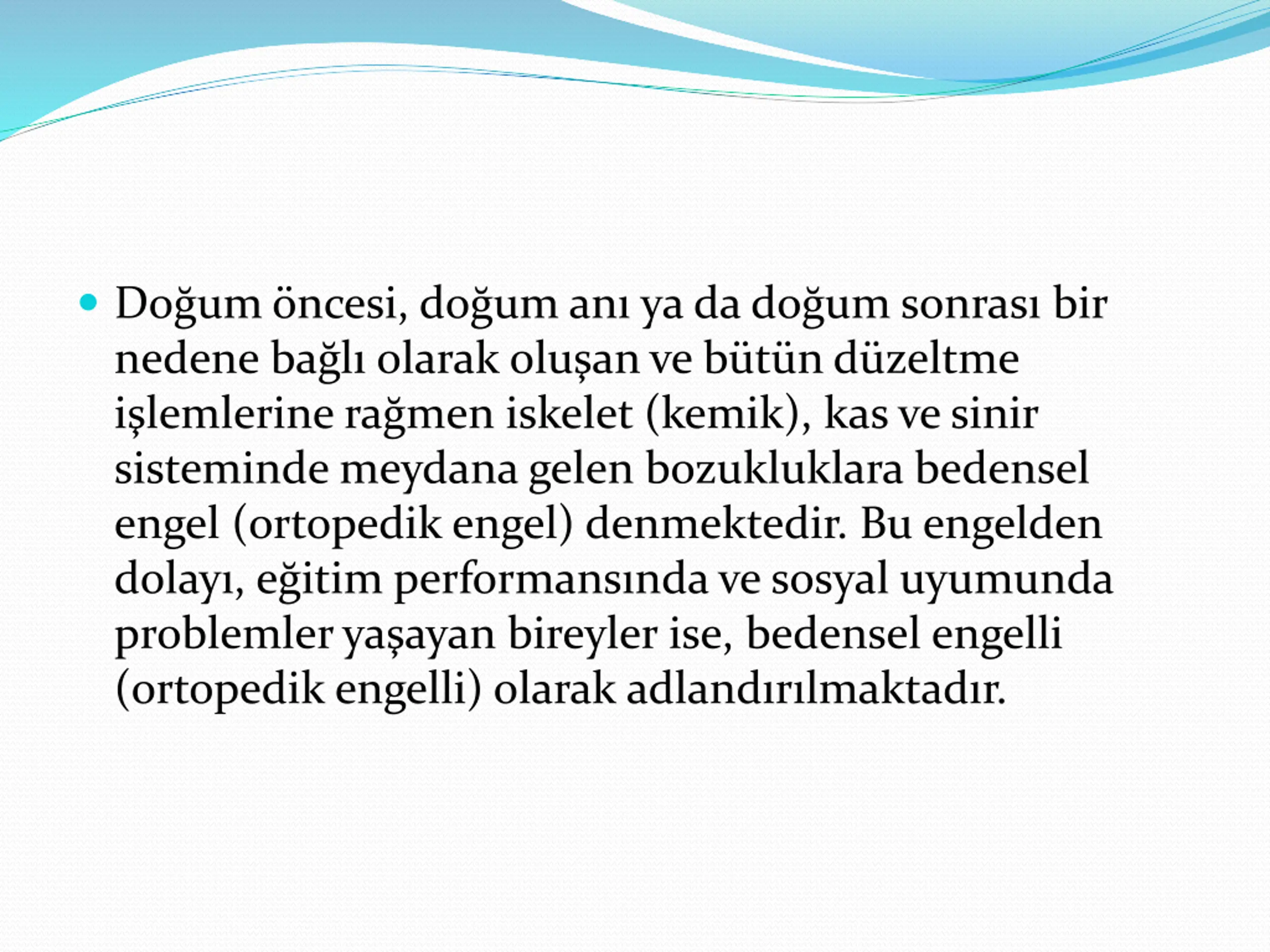 Doum ncesi, doum an ya da doum sonras bir nedene ba l olarak olu an ve b t n d zeltme i lemlerine ra men iskelet (kemik), kas ve sinir sisteminde meydana gelen bozukluklara bedensel engel (ortopedik engel) denmektedir. Bu engelden dolay , e itim performans nda ve sosyal uyumunda problemler ya ayan bireyler ise, bedensel engelli (ortopedik engelli) olarak adland r lmaktad r.