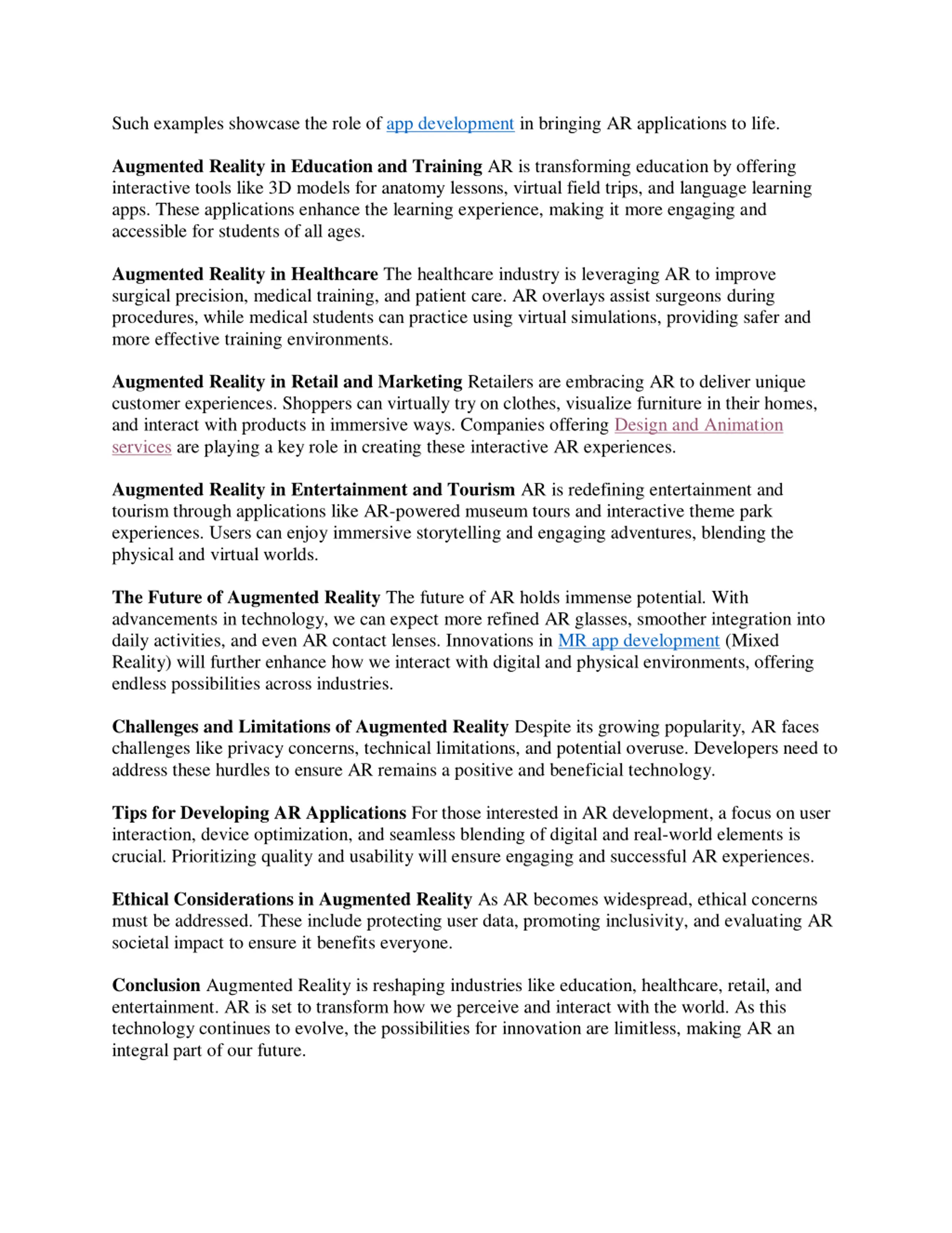 Such examples showcase the role of app development in bringing AR applications to life. Augmented Reality in Education and Training AR is transforming education by offering interactive tools like 3D models for anatomy lessons, virtual field trips, and language learning apps. These applications enhance the learning experience, making it more engaging and accessible for students of all ages. Augmented Reality in Healthcare The healthcare industry is leveraging AR to improve surgical precision, medical training, and patient care. AR overlays assist surgeons during procedures, while medical students can practice using virtual simulations, providing safer and more effective training environments. Augmented Reality in Retail and Marketing Retailers are embracing AR to deliver unique customer experiences. Shoppers can virtually try on clothes, visualize furniture in their homes, and interact with products in immersive ways. Companies offering Design and Animation services are playing a key role in creating these interactive AR experiences. Augmented Reality in Entertainment and Tourism AR is redefining entertainment and tourism through applications like AR-powered museum tours and interactive theme park experiences. Users can enjoy immersive storytelling and engaging adventures, blending the physical and virtual worlds. The Future of Augmented Reality The future of AR holds immense potential. With advancements in technology, we can expect more refined AR glasses, smoother integration into daily activities, and even AR contact lenses. Innovations in MR app development (Mixed Reality) will further enhance how we interact with digital and physical environments, offering endless possibilities across industries. Challenges and Limitations of Augmented Reality Despite its growing popularity, AR faces challenges like privacy concerns, technical limitations, and potential overuse. Developers need to address these hurdles to ensure AR remains a positive and beneficial technology. Tips for Developing AR Applications For those interested in AR development, a focus on user interaction, device optimization, and seamless blending of digital and real-world elements is crucial. Prioritizing quality and usability will ensure engaging and successful AR experiences. Ethical Considerations in Augmented Reality As AR becomes widespread, ethical concerns must be addressed. These include protecting user data, promoting inclusivity, and evaluating AR societal impact to ensure it benefits everyone. Conclusion Augmented Reality is reshaping industries like education, healthcare, retail, and entertainment. AR is set to transform how we perceive and interact with the world. As this technology continues to evolve, the possibilities for innovation are limitless, making AR an integral part of our future.