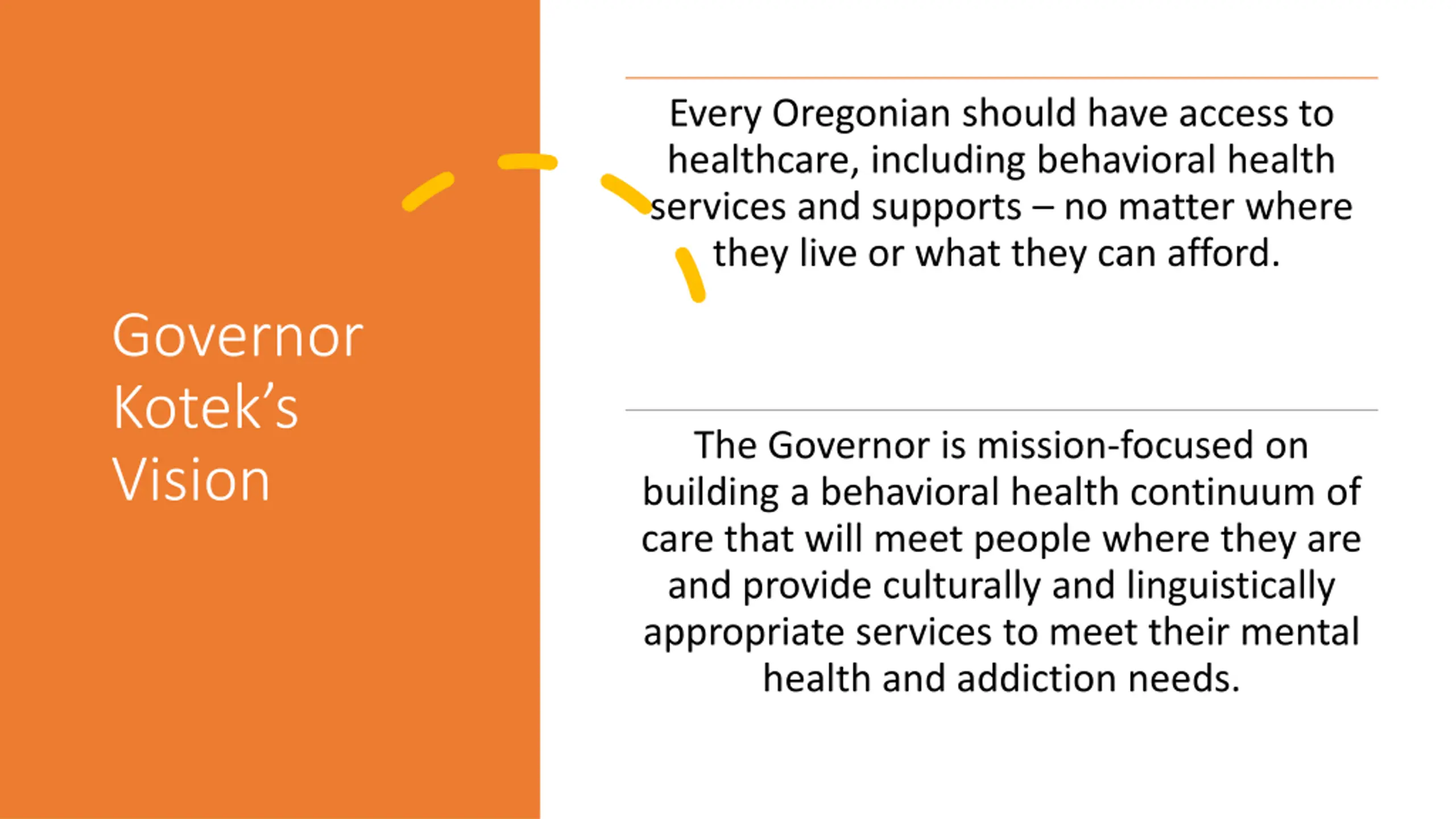 Every Oregonian should have access to healthcare, including behavioral health services and supports no matter where they live or what they can afford. Governor Kotek s Vision The Governor is mission-focused on building a behavioral health continuum of care that will meet people where they are and provide culturally and linguistically appropriate services to meet their mental health and addiction needs.