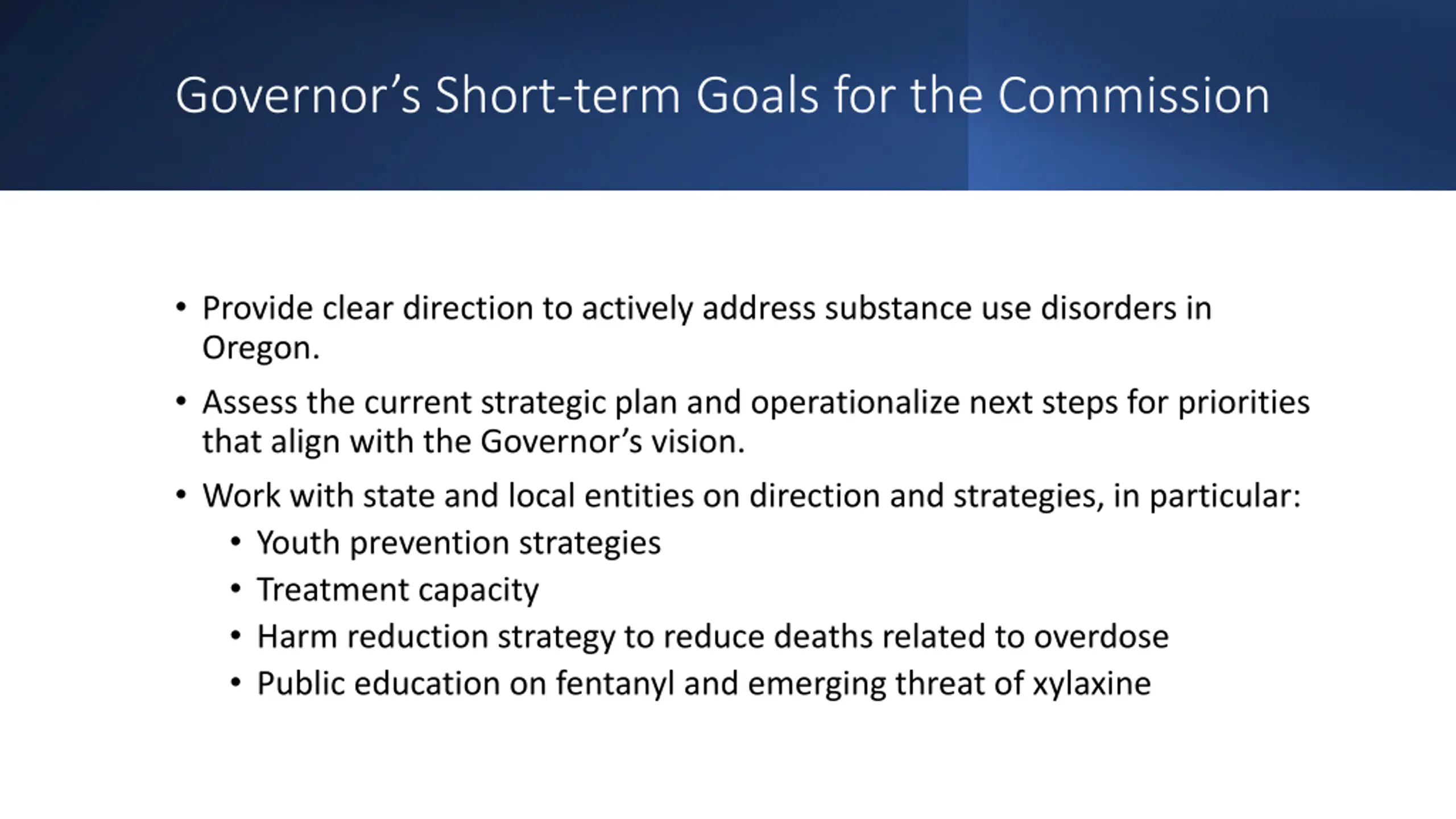 Governors Short-term Goals for the Commission Provide clear direction to actively address substance use disorders in Oregon. Assess the current strategic plan and operationalize next steps for priorities that align with the Governor s vision. Work with state and local entities on direction and strategies, in particular: Youth prevention strategies Treatment capacity Harm reduction strategy to reduce deaths related to overdose Public education on fentanyl and emerging threat of xylaxine