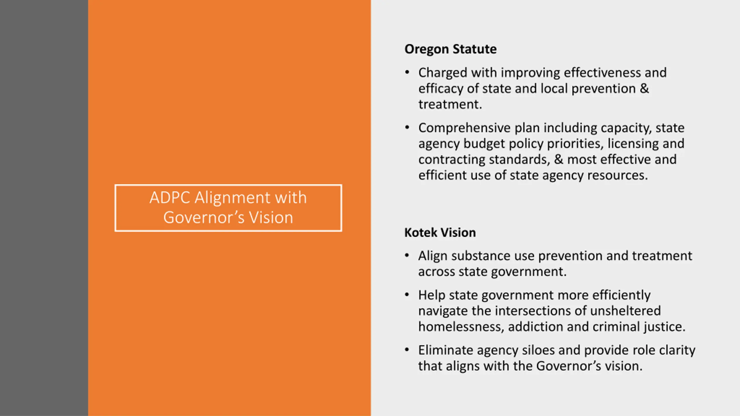 Oregon Statute Charged with improving effectiveness and efficacy of state and local prevention & treatment. Comprehensive plan including capacity, state agency budget policy priorities, licensing and contracting standards, & most effective and efficient use of state agency resources. ADPC Alignment with Governor s Vision Kotek Vision Align substance use prevention and treatment across state government. Help state government more efficiently navigate the intersections of unsheltered homelessness, addiction and criminal justice. Eliminate agency siloes and provide role clarity that aligns with the Governor s vision.