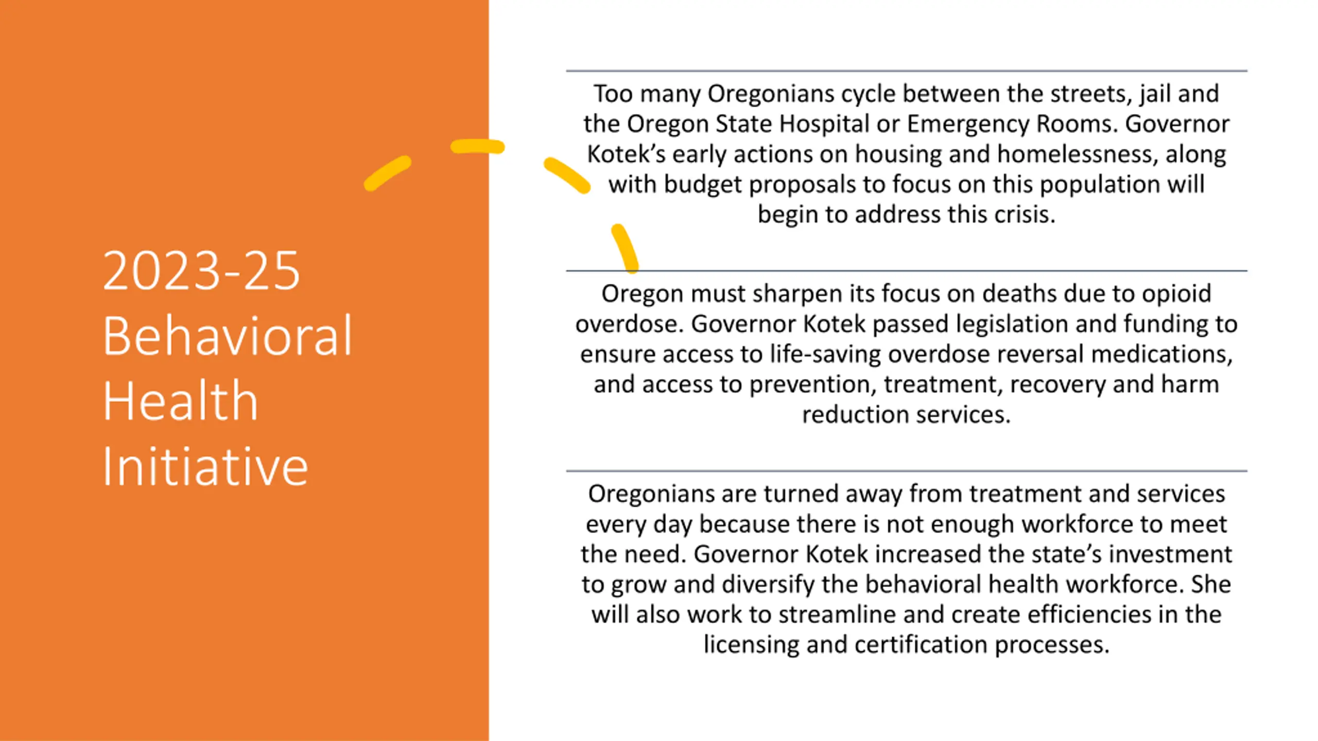 Too many Oregonians cycle between the streets, jail and the Oregon State Hospital or Emergency Rooms. Governor Kotek s early actions on housing and homelessness, along with budget proposals to focus on this population will begin to address this crisis. 2023-25 Behavioral Health Initiative Oregon must sharpen its focus on deaths due to opioid overdose. Governor Kotek passed legislation and funding to ensure access to life-saving overdose reversal medications, and access to prevention, treatment, recovery and harm reduction services. Oregonians are turned away from treatment and services every day because there is not enough workforce to meet the need. Governor Kotek increased the state s investment to grow and diversify the behavioral health workforce. She will also work to streamline and create efficiencies in the licensing and certification processes.