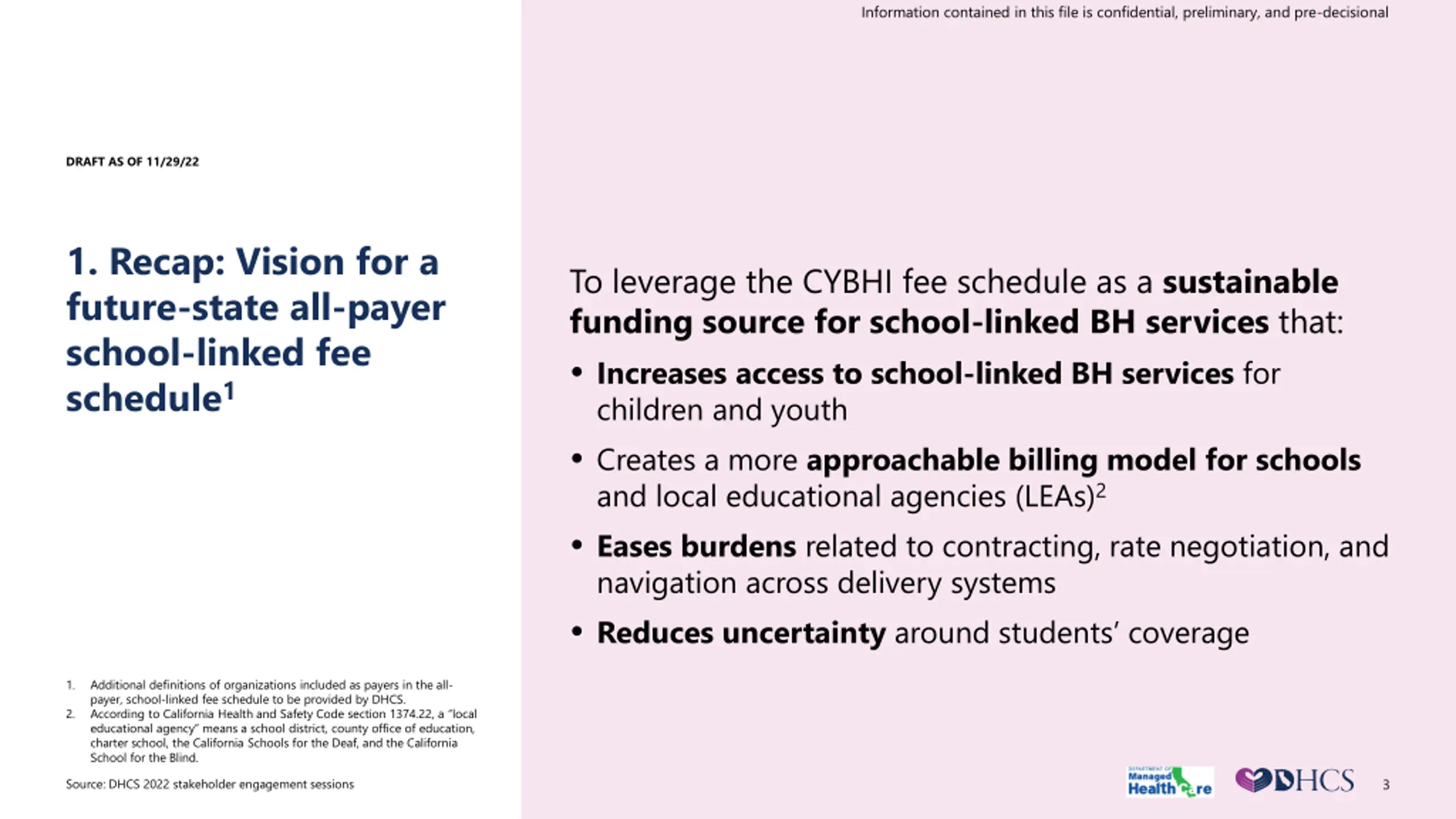 Information contained in this file is confidential, preliminary, and pre-decisional DRAFT AS OF 11/29/22 1. Recap: Vision for a future-state all-payer school-linked fee schedule1 To leverage the CYBHI fee schedule as a sustainable funding source for school-linked BH services that: Increases access to school-linked BH services for children and youth Creates a more approachable billing model for schools and local educational agencies (LEAs)2 Eases burdens related to contracting, rate negotiation, and navigation across delivery systems Reduces uncertainty around students coverage 1. Additional definitions of organizations included as payers in the all- payer, school-linked fee schedule to be provided by DHCS. According to California Health and Safety Code section 1374.22, a local educational agency means a school district, county office of education, charter school, the California Schools for the Deaf, and the California School for the Blind. 2. 3 Source: DHCS 2022 stakeholder engagement sessions