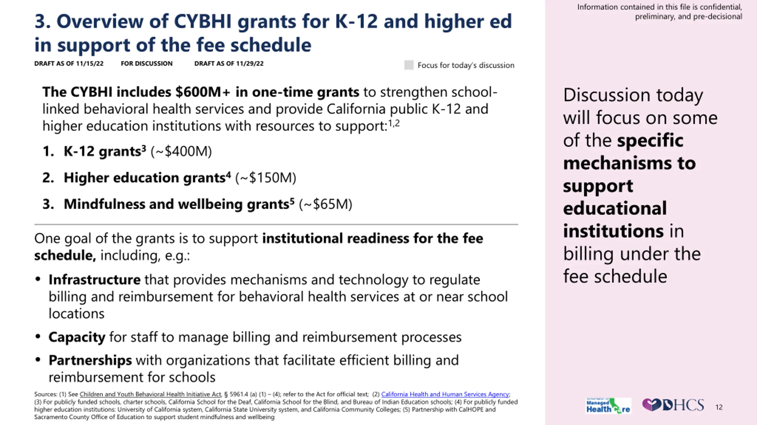 Information contained in this file is confidential, preliminary, and pre-decisional 3. Overview of CYBHI grants for K-12 and higher ed in support of the fee schedule DRAFT AS OF 11/15/22 FOR DISCUSSION DRAFT AS OF 11/29/22 Focus for today s discussion Discussion today will focus on some of the specific mechanisms to support educational institutions in billing under the fee schedule The CYBHI includes $600M+ in one-time grants to strengthen school- linked behavioral health services and provide California public K-12 and higher education institutions with resources to support:1,2 1. K-12 grants3(~$400M) 2. Higher education grants4(~$150M) 3. Mindfulness and wellbeing grants5(~$65M) One goal of the grants is to support institutional readiness for the fee schedule, including, e.g.: Infrastructure that provides mechanisms and technology to regulate billing and reimbursement for behavioral health services at or near school locations Capacity for staff to manage billing and reimbursement processes Partnerships with organizations that facilitate efficient billing and reimbursement for schools Sources: (1) See Children and Youth Behavioral Health Initiative Act, 5961.4 (a) (1) (4); refer to the Act for official text; (2) California Health and Human Services Agency; (3) For publicly funded schools, charter schools, California School for the Deaf, California School for the Blind, and Bureau of Indian Education schools; (4) For publicly funded higher education institutions: University of California system, California State University system, and California Community Colleges; (5) Partnership with CalHOPE and Sacramento County Office of Education to support student mindfulness and wellbeing 12