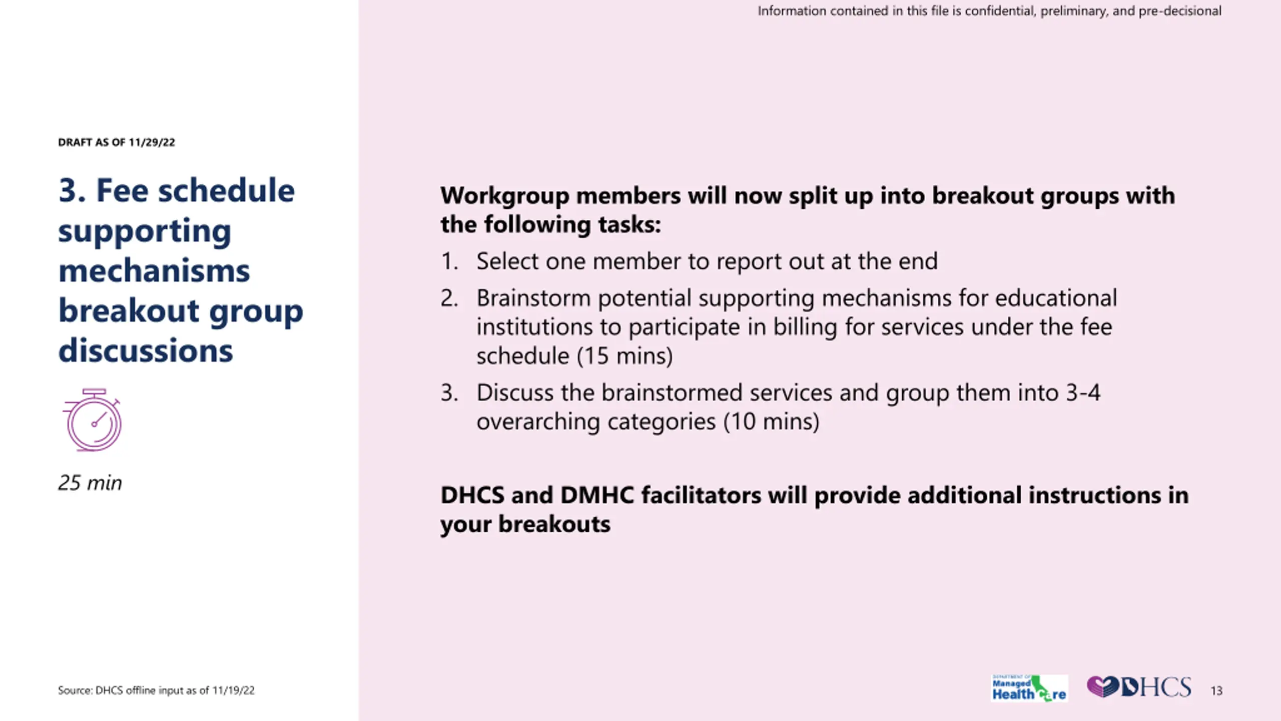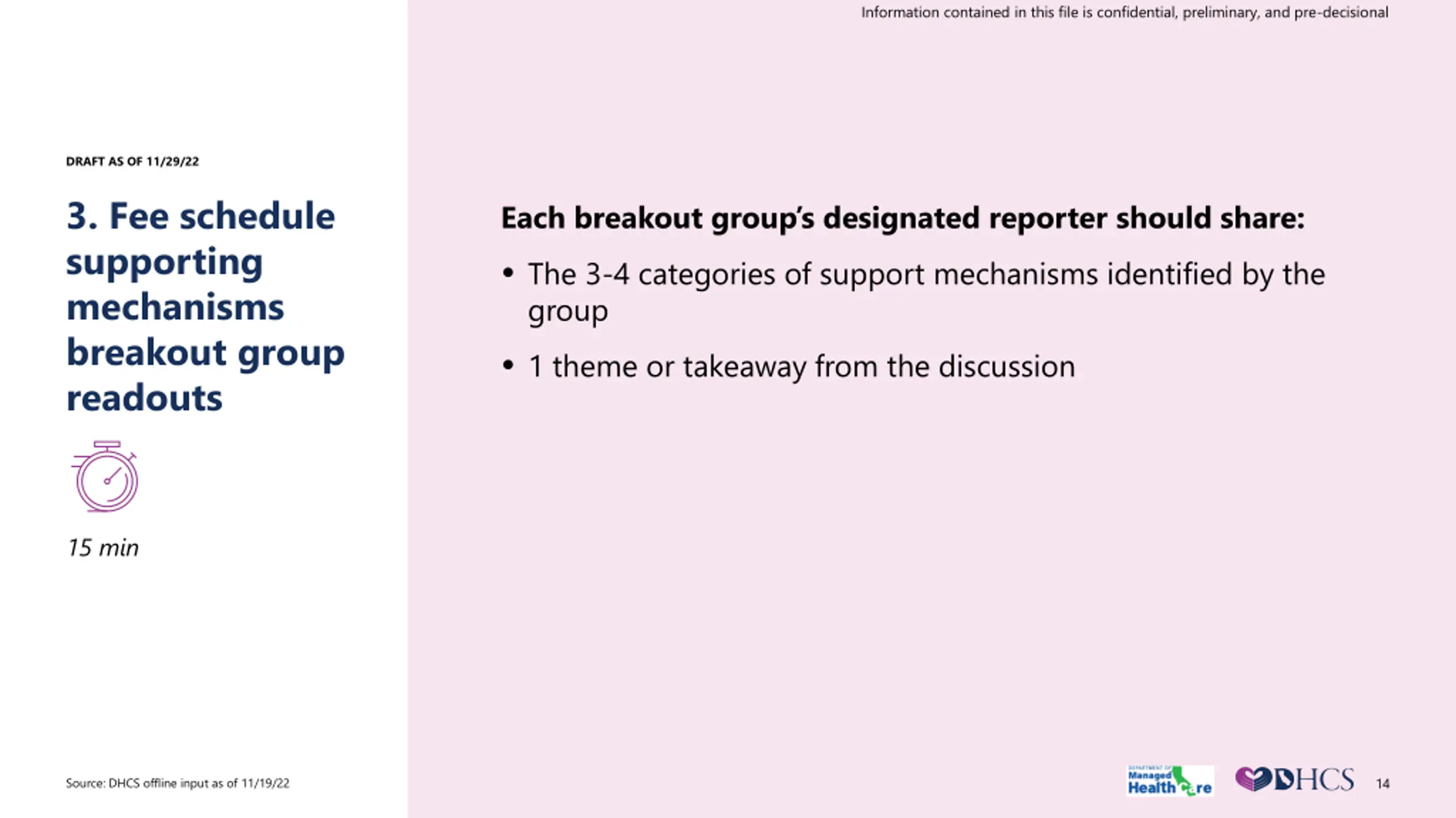Information contained in this file is confidential, preliminary, and pre-decisional DRAFT AS OF 11/29/22 3. Fee schedule supporting mechanisms breakout group readouts Each breakout group s designated reporter should share: The 3-4 categories of support mechanisms identified by the group 1 theme or takeaway from the discussion 15 min 14 Source: DHCS offline input as of 11/19/22