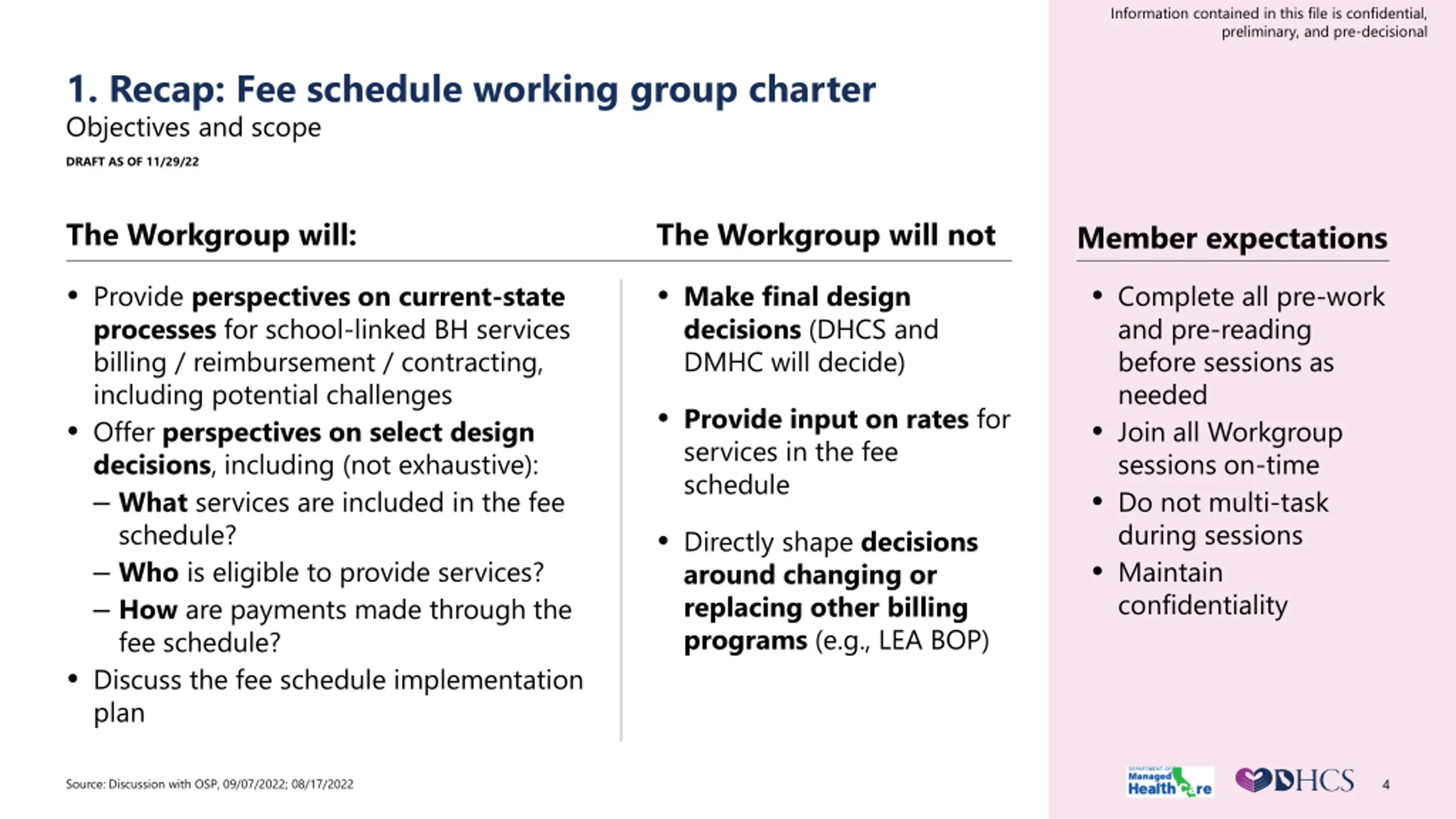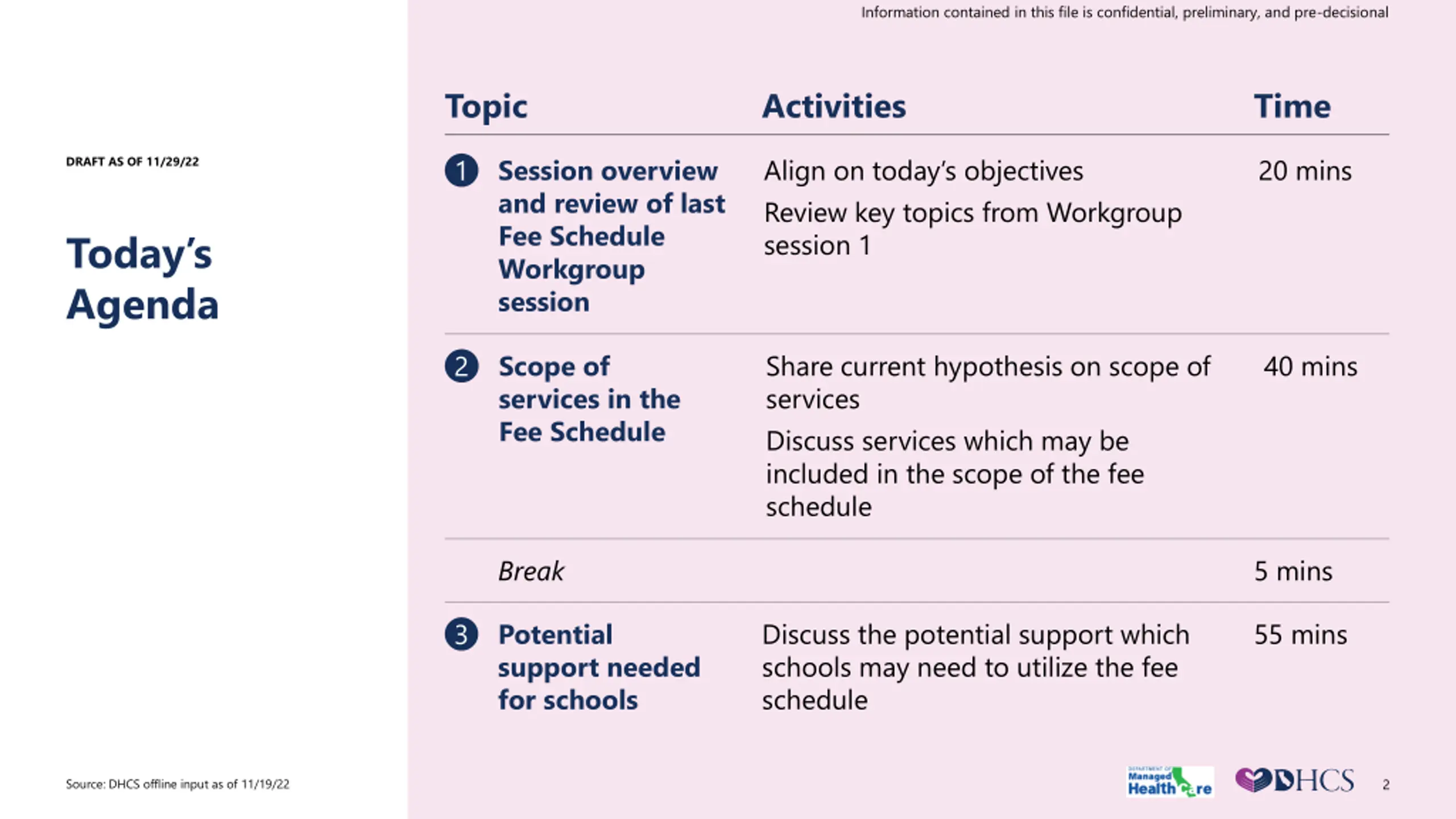 Information contained in this file is confidential, preliminary, and pre-decisional Topic Activities Time Session overview and review of last Fee Schedule Workgroup session Align on today s objectives Review key topics from Workgroup session 1 20 mins 1 DRAFT AS OF 11/29/22 Today s Agenda Scope of services in the Fee Schedule Share current hypothesis on scope of services Discuss services which may be included in the scope of the fee schedule 40 mins 2 Break 5 mins Potential support needed for schools Discuss the potential support which schools may need to utilize the fee schedule 55 mins 3 2 Source: DHCS offline input as of 11/19/22
