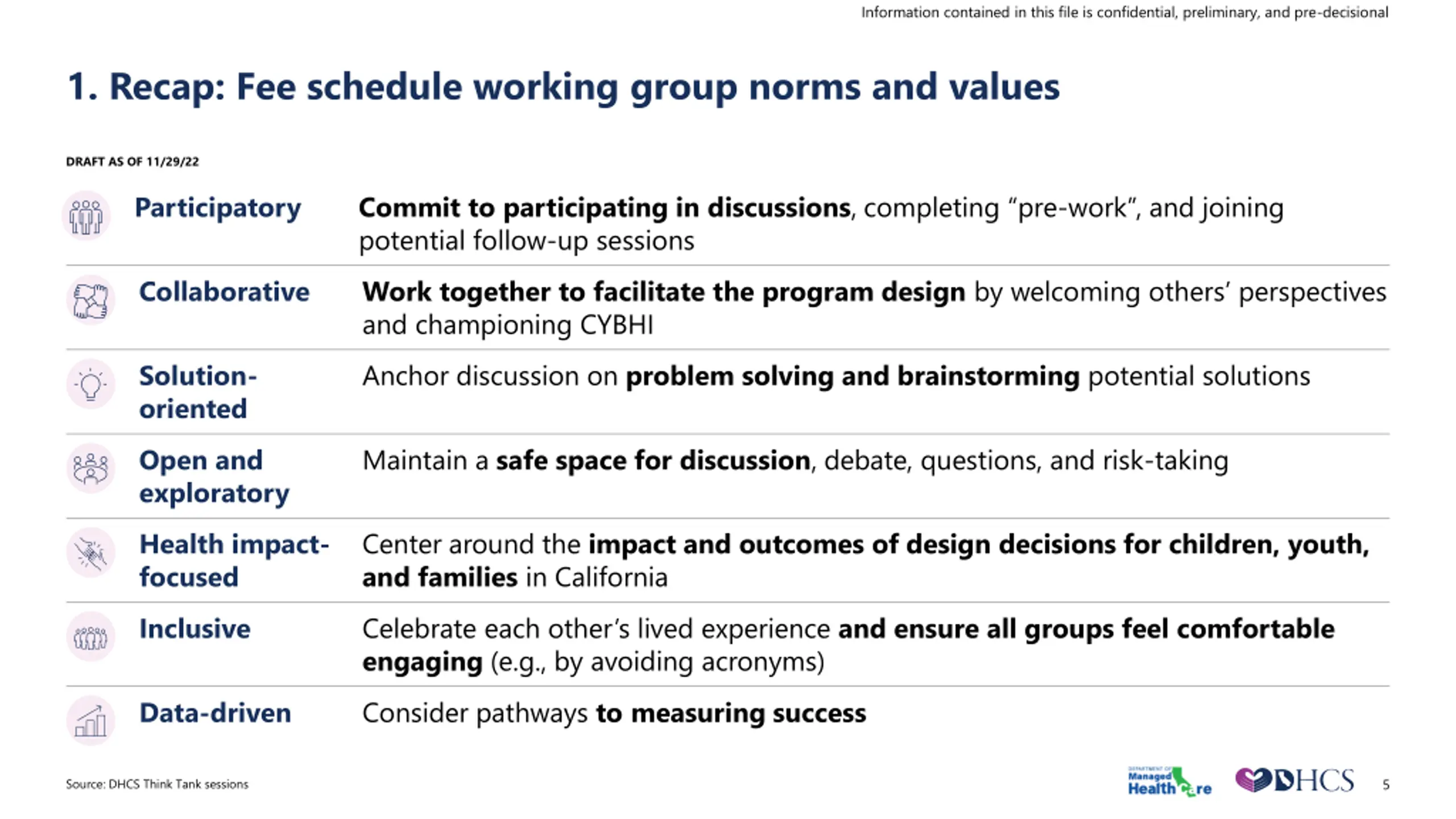 Information contained in this file is confidential, preliminary, and pre-decisional 1. Recap: Fee schedule working group norms and values DRAFT AS OF 11/29/22 Participatory Commit to participating in discussions, completing pre-work , and joining potential follow-up sessions Collaborative Work together to facilitate the program design by welcoming others perspectives and championing CYBHI Solution- oriented Anchor discussion on problem solving and brainstorming potential solutions Open and exploratory Maintain a safe space for discussion, debate, questions, and risk-taking Health impact- focused Center around the impact and outcomes of design decisions for children, youth, and families in California Inclusive Celebrate each other s lived experience and ensure all groups feel comfortable engaging (e.g., by avoiding acronyms) Data-driven Consider pathways to measuring success 5 Source: DHCS Think Tank sessions