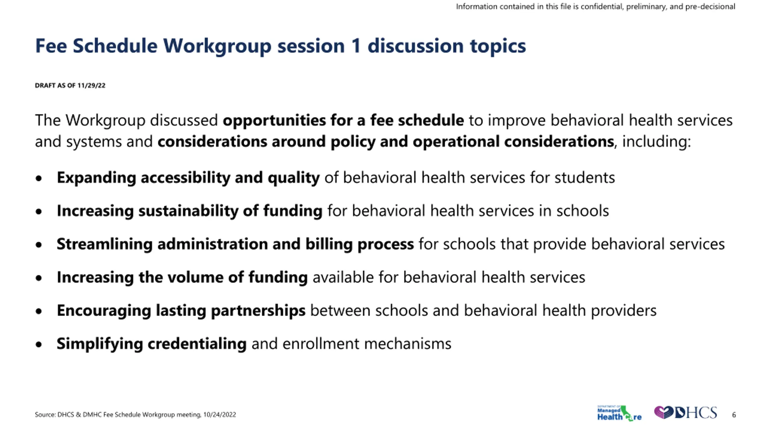 Information contained in this file is confidential, preliminary, and pre-decisional Fee Schedule Workgroup session 1 discussion topics DRAFT AS OF 11/29/22 The Workgroup discussed opportunities for a fee schedule to improve behavioral health services and systems and considerations around policy and operational considerations, including: Expanding accessibility and quality of behavioral health services for students Increasing sustainability of funding for behavioral health services in schools Streamlining administration and billing process for schools that provide behavioral services Increasing the volume of funding available for behavioral health services Encouraging lasting partnerships between schools and behavioral health providers Simplifying credentialing and enrollment mechanisms 6 Source: DHCS & DMHC Fee Schedule Workgroup meeting, 10/24/2022