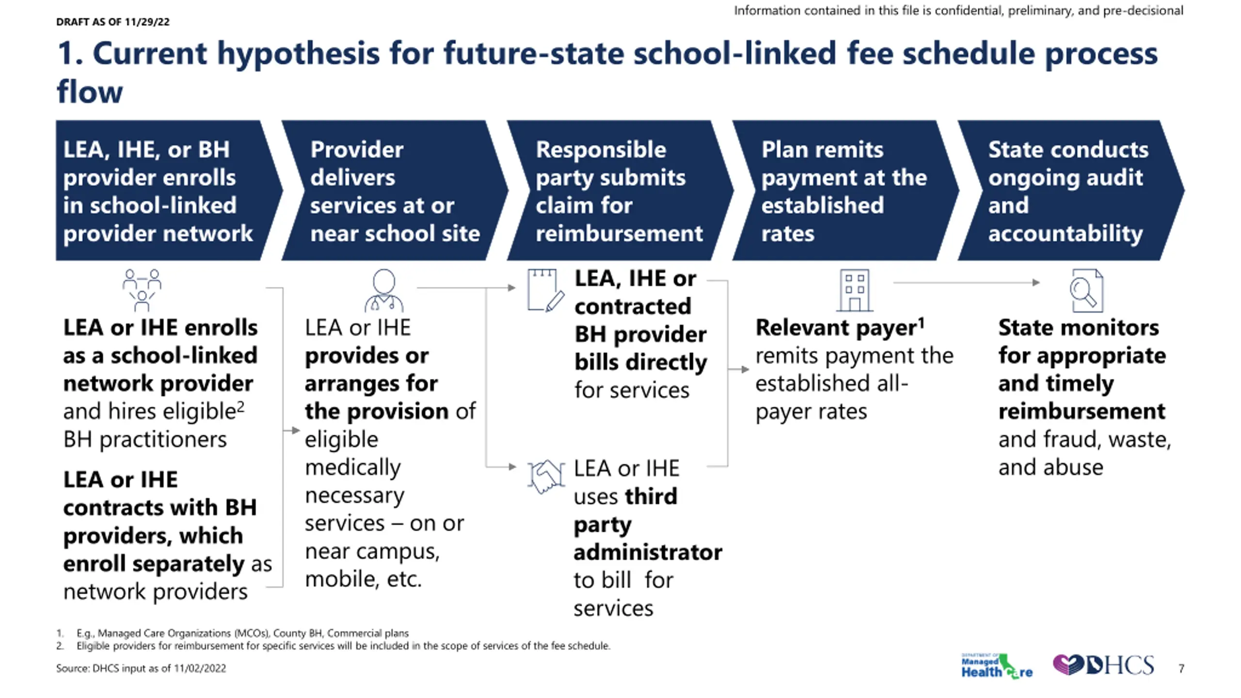 Information contained in this file is confidential, preliminary, and pre-decisional DRAFT AS OF 11/29/22 1. Current hypothesis for future-state school-linked fee schedule process flow LEA, IHE, or BH provider enrolls in school-linked provider network Provider delivers services at or near school site Responsible party submits claim for reimbursement Plan remits payment at the established rates State conducts ongoing audit and accountability LEA, IHE or contracted BH provider bills directly for services LEA or IHE enrolls as a school-linked network provider and hires eligible2 BH practitioners LEA or IHE contracts with BH providers, which enroll separately as network providers LEA or IHE provides or arranges for the provision of eligible medically necessary services on or near campus, mobile, etc. Relevant payer1 remits payment the established all- payer rates State monitors for appropriate and timely reimbursement and fraud, waste, and abuse LEA or IHE uses third party administrator to bill for services 1. 2. E.g., Managed Care Organizations (MCOs), County BH, Commercial plans Eligible providers for reimbursement for specific services will be included in the scope of services of the fee schedule. 7 Source: DHCS input as of 11/02/2022