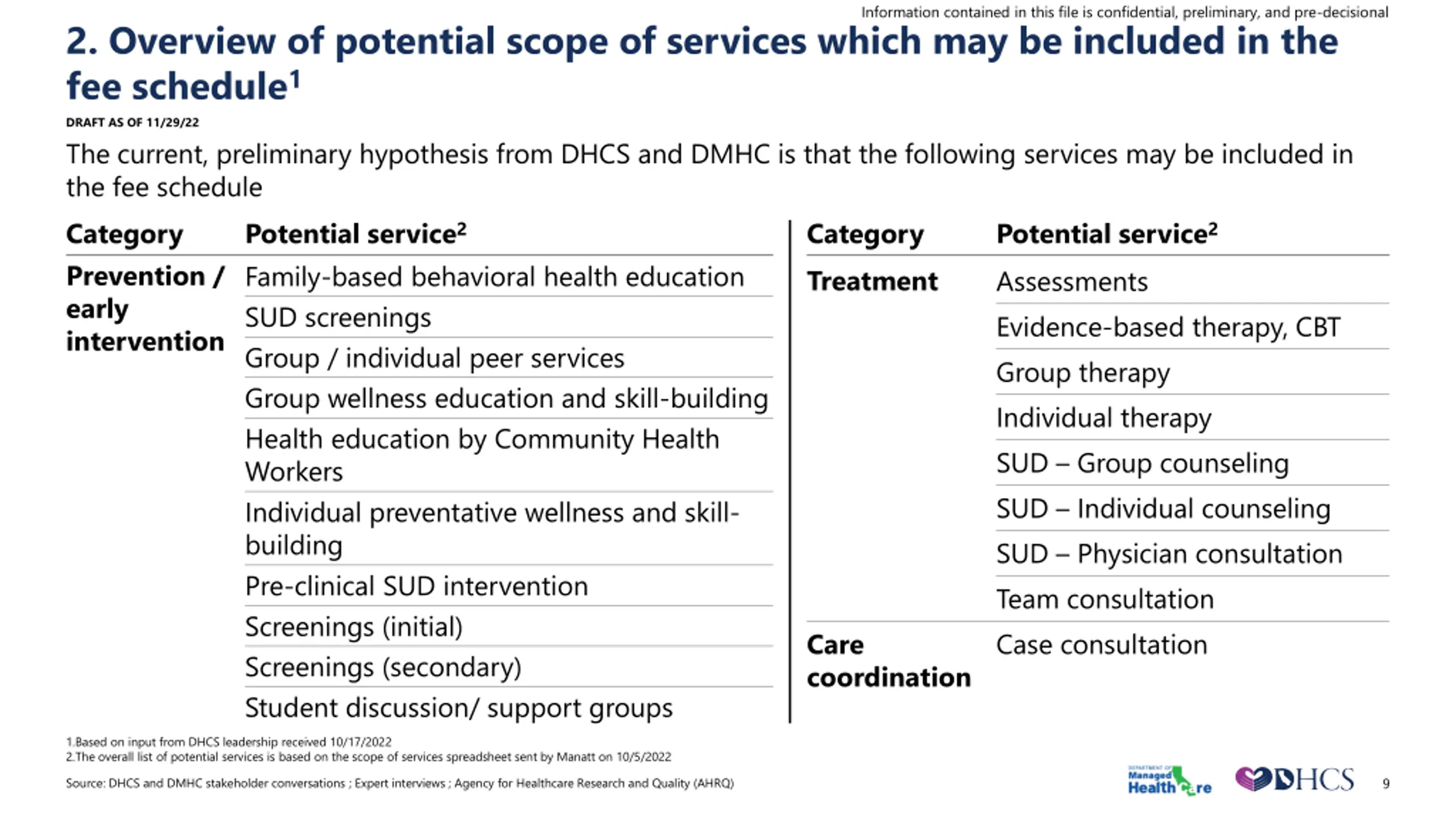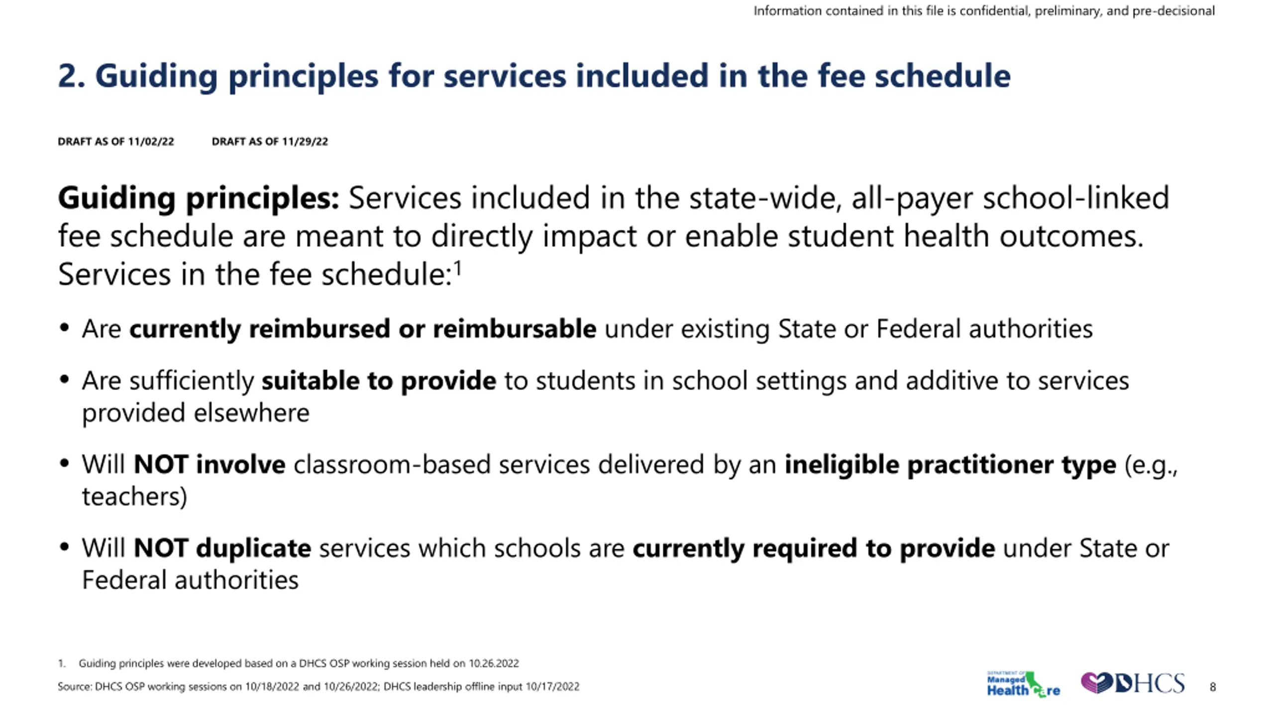 Information contained in this file is confidential, preliminary, and pre-decisional 2. Guiding principles for services included in the fee schedule DRAFT AS OF 11/02/22 DRAFT AS OF 11/29/22 Guiding principles: Services included in the state-wide, all-payer school-linked fee schedule are meant to directly impact or enable student health outcomes. Services in the fee schedule:1 Are currently reimbursed or reimbursable under existing State or Federal authorities Are sufficiently suitable to provide to students in school settings and additive to services provided elsewhere Will NOT involve classroom-based services delivered by an ineligible practitioner type (e.g., teachers) Will NOT duplicate services which schools are currently required to provide under State or Federal authorities 1. Guiding principles were developed based on a DHCS OSP working session held on 10.26.2022 8 Source: DHCS OSP working sessions on 10/18/2022 and 10/26/2022; DHCS leadership offline input 10/17/2022