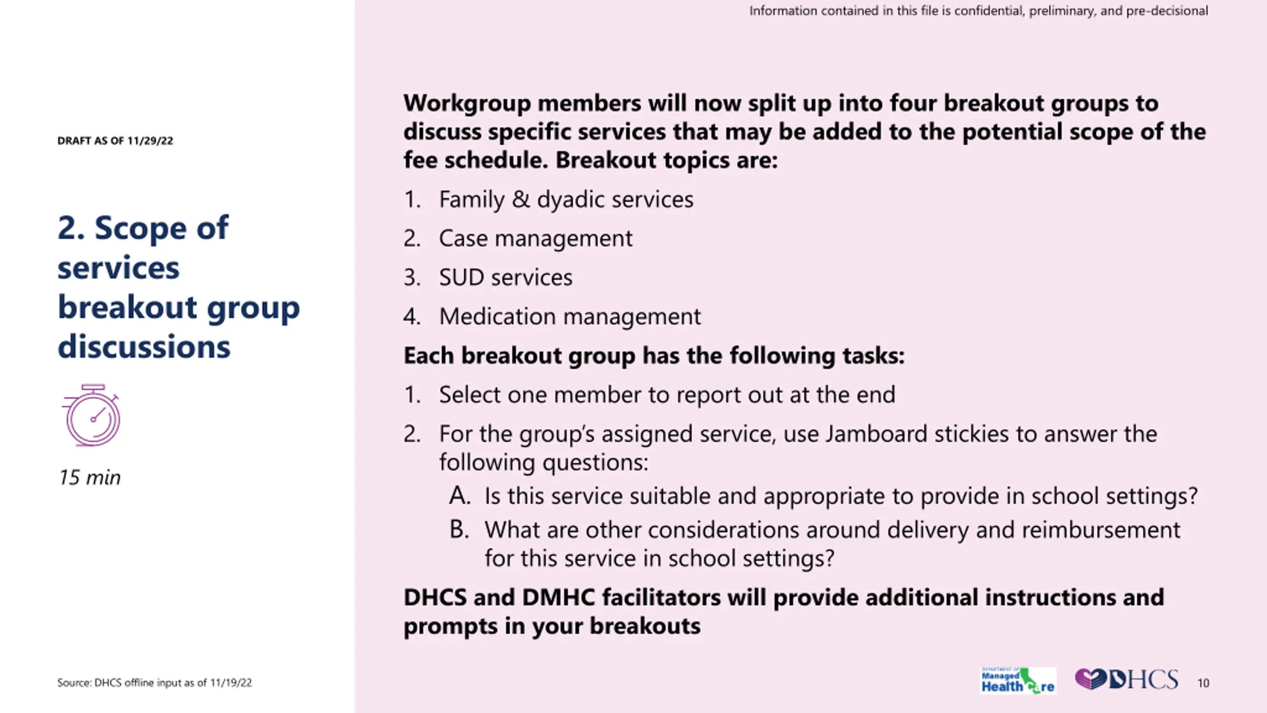 Information contained in this file is confidential, preliminary, and pre-decisional Workgroup members will now split up into four breakout groups to discuss specific services that may be added to the potential scope of the fee schedule. Breakout topics are: 1. Family & dyadic services 2. Case management 3. SUD services 4. Medication management Each breakout group has the following tasks: 1. Select one member to report out at the end 2. For the group s assigned service, use Jamboard stickies to answer the following questions: A. Is this service suitable and appropriate to provide in school settings? B. What are other considerations around delivery and reimbursement for this service in school settings? DHCS and DMHC facilitators will provide additional instructions and prompts in your breakouts DRAFT AS OF 11/29/22 2. Scope of services breakout group discussions 15 min 10 Source: DHCS offline input as of 11/19/22