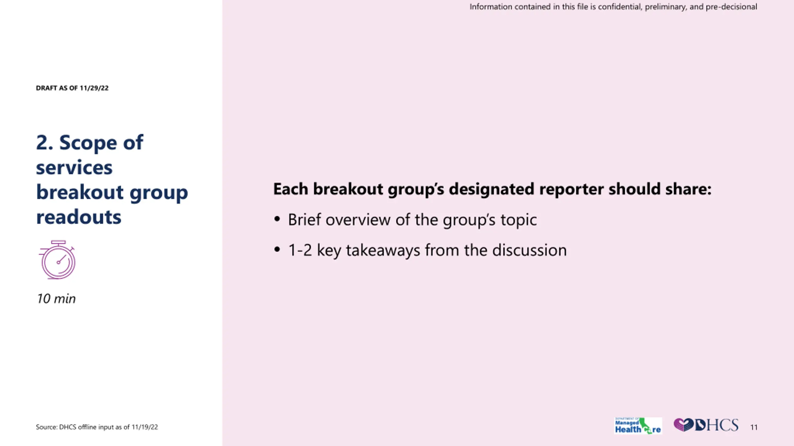Information contained in this file is confidential, preliminary, and pre-decisional DRAFT AS OF 11/29/22 2. Scope of services breakout group readouts Each breakout group s designated reporter should share: Brief overview of the group s topic 1-2 key takeaways from the discussion 10 min 11 Source: DHCS offline input as of 11/19/22