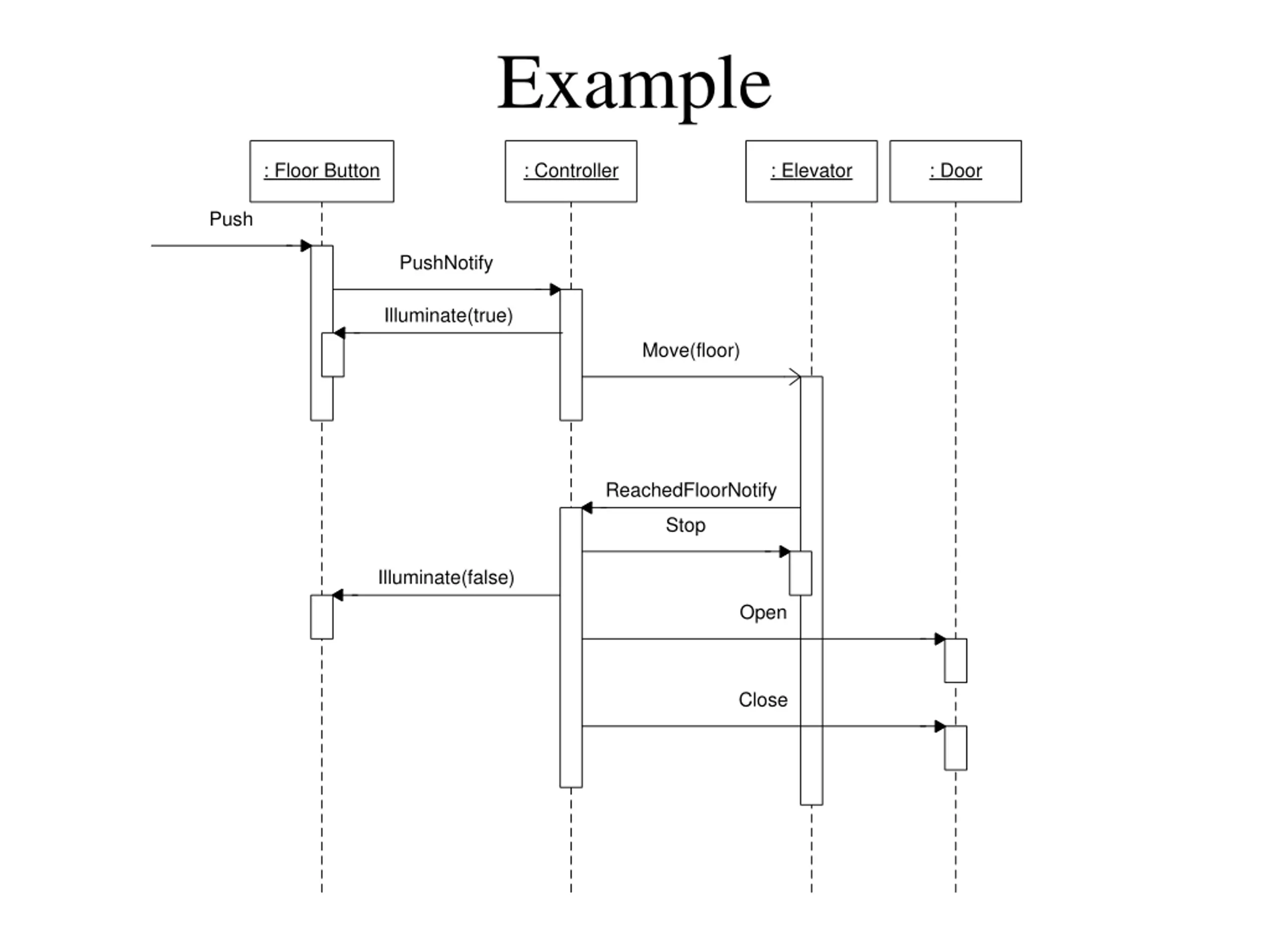 Example : Floor Button : Controller : Elevator : Door Push PushNotify Illuminate(true) Move(floor) ReachedFloorNotify Stop Illuminate(false) Open Close