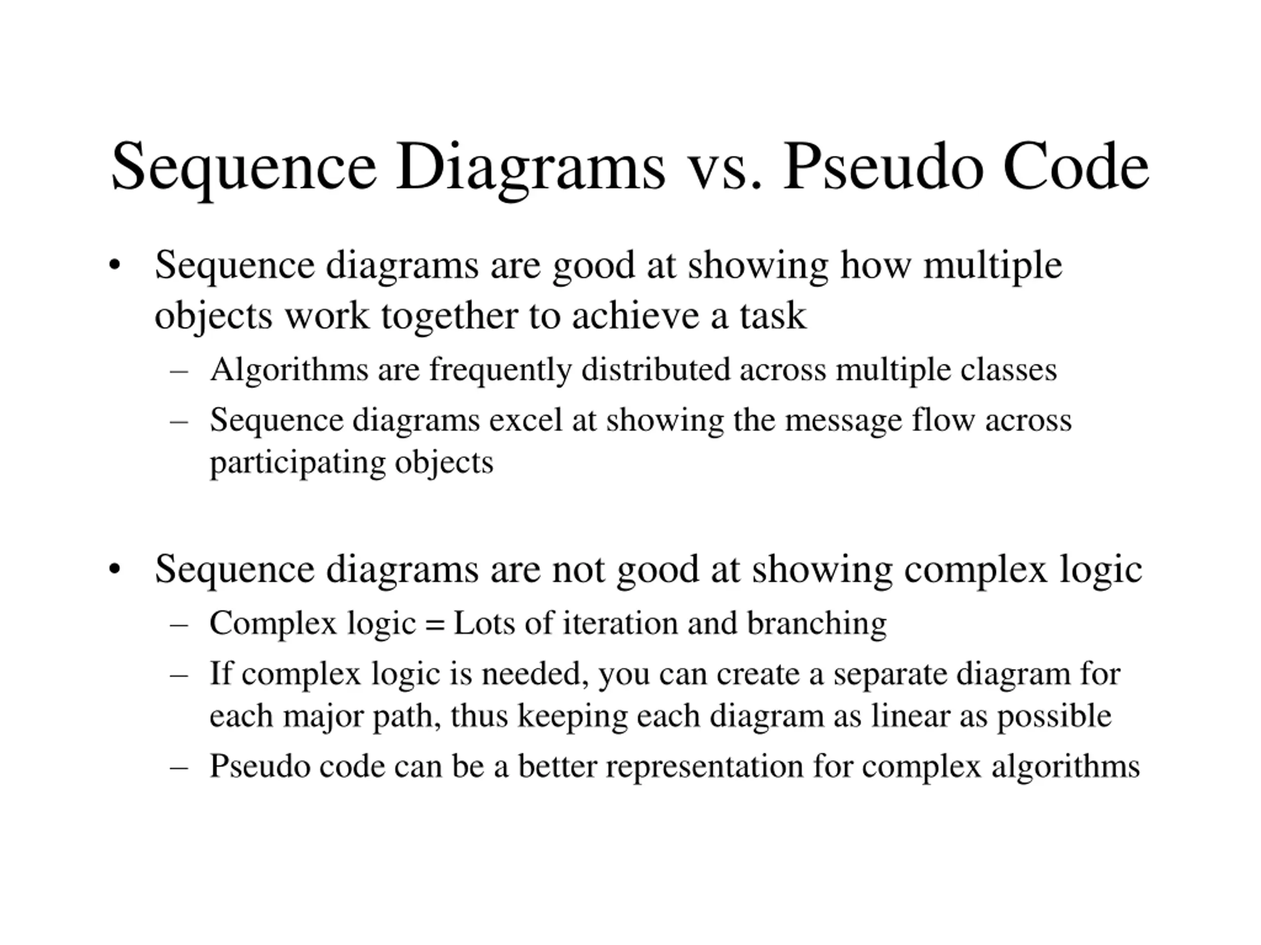 Sequence Diagrams vs. Pseudo Code Sequence diagrams are good at showing how multiple objects work together to achieve a task Algorithms are frequently distributed across multiple classes Sequence diagrams excel at showing the message flow across participating objects Sequence diagrams are not good at showing complex logic Complex logic = Lots of iteration and branching If complex logic is needed, you can create a separate diagram for each major path, thus keeping each diagram as linear as possible Pseudo code can be a better representation for complex algorithms