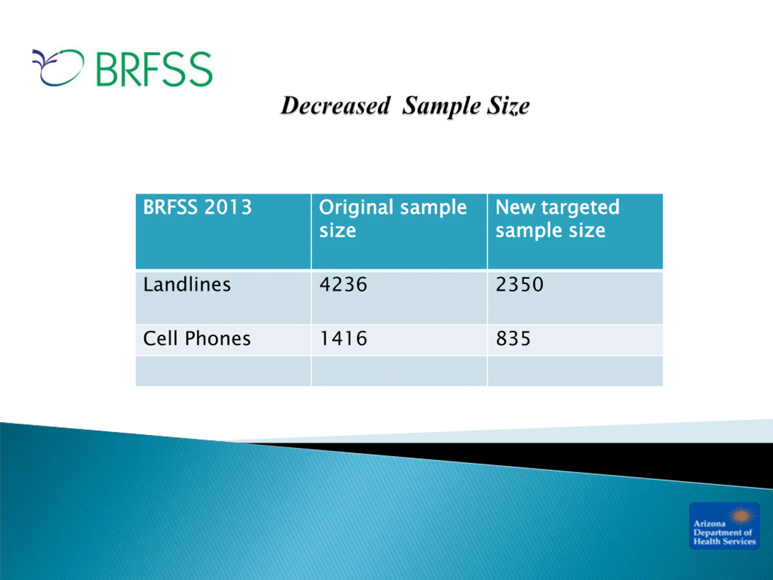 BRFSS BRFSS 2013 2013 Original size Original sample size sample New targeted sample size New targeted sample size Landlines 4236 2350 Cell Phones 1416 835