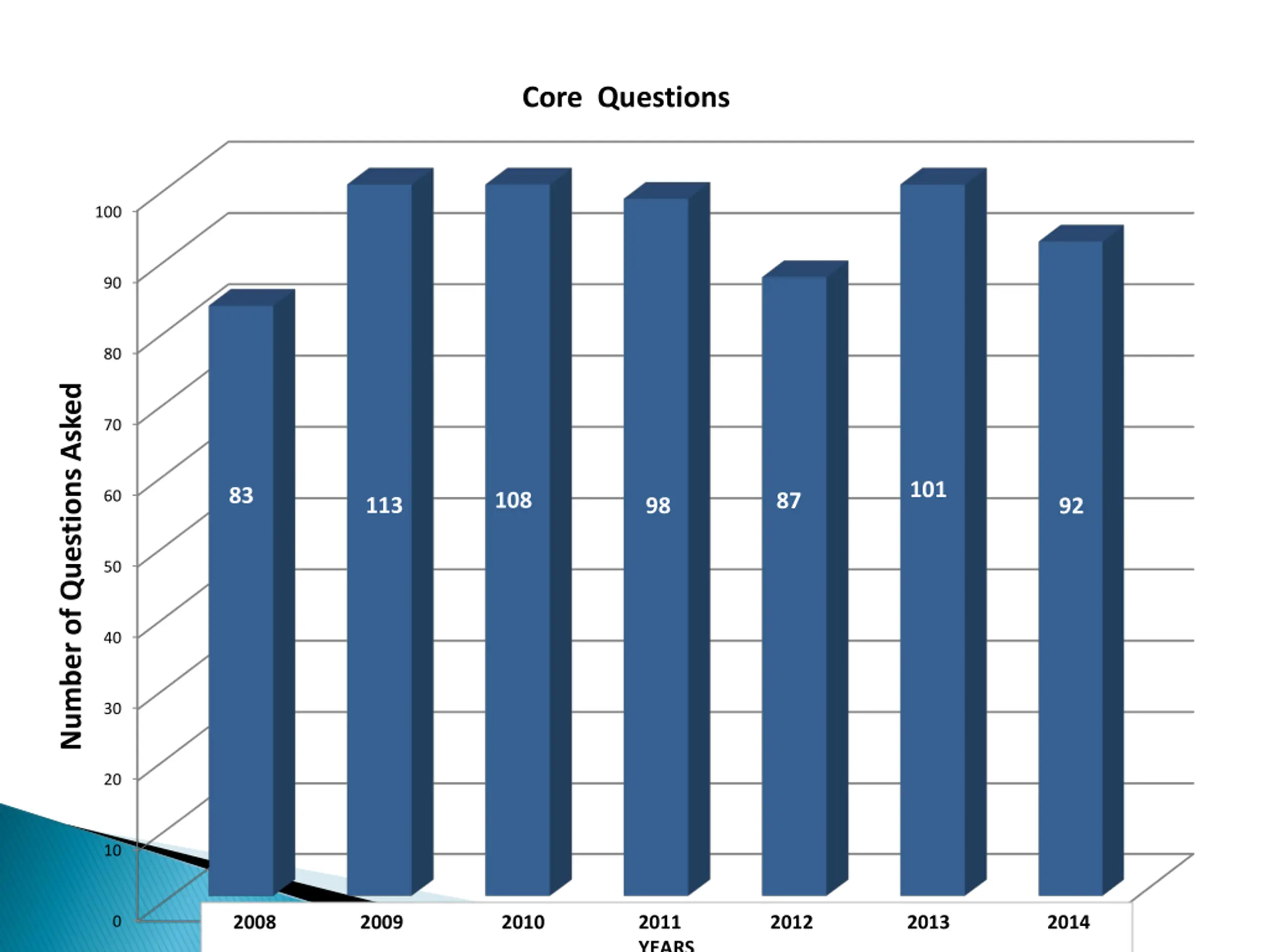 Core Questions 100 90 80 Number of Questions Asked 70 101 83 60 108 87 113 98 92 50 40 30 20 10 2008 2009 2010 2011 YEARS 2012 2013 2014 0