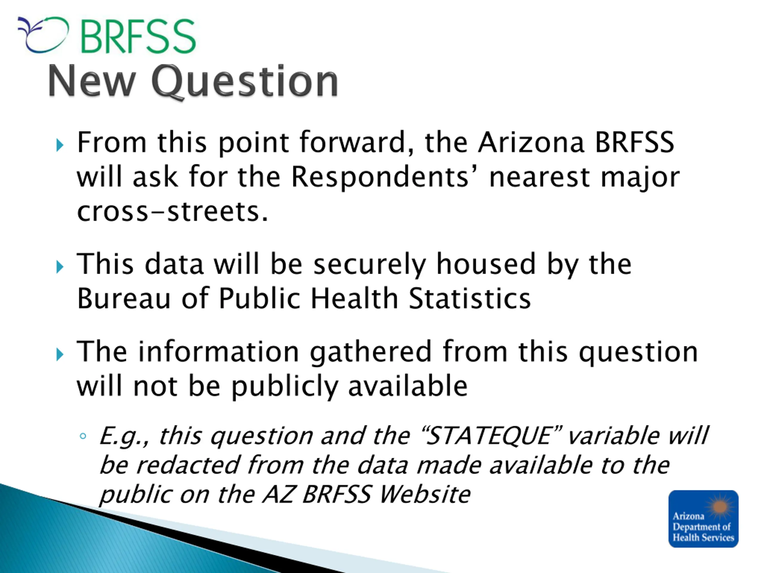 From this point forward, the Arizona BRFSS will ask for the Respondents nearest major cross-streets. This data will be securely housed by the Bureau of Public Health Statistics The information gathered from this question will not be publicly available E.g., this question and the STATEQUE variable will be redacted from the data made available to the public on the AZ BRFSS Website