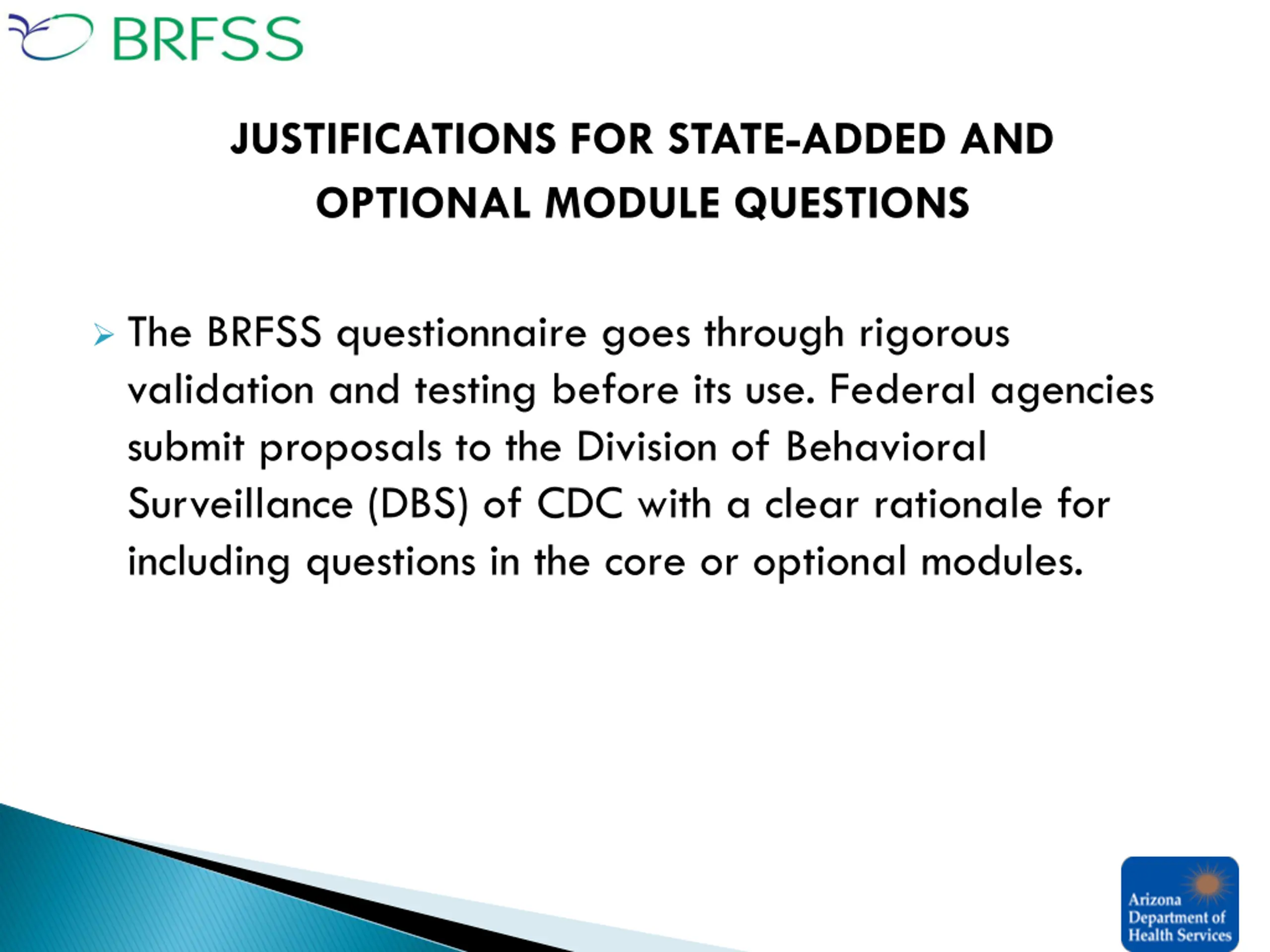 JUSTIFICATIONS FOR STATE-ADDED AND OPTIONAL MODULE QUESTIONS The BRFSS questionnaire goes through rigorous validation and testing before its use. Federal agencies submit proposals to the Division of Behavioral Surveillance (DBS) of CDC with a clear rationale for including questions in the core or optional modules.