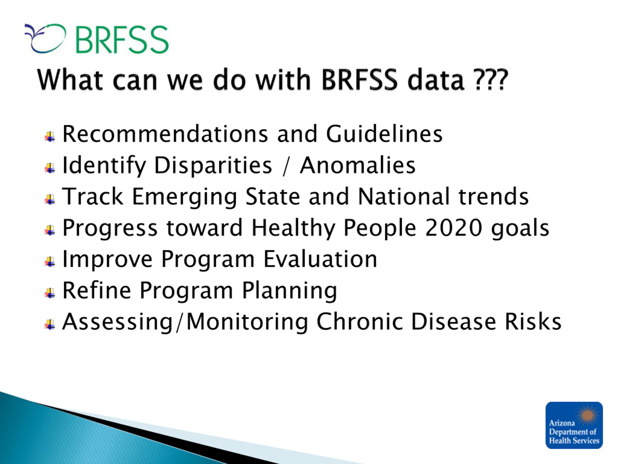 Recommendations and Guidelines Identify Disparities / Anomalies Track Emerging State and National trends Progress toward Healthy People 2020 goals Improve Program Evaluation Refine Program Planning Assessing/Monitoring Chronic Disease Risks