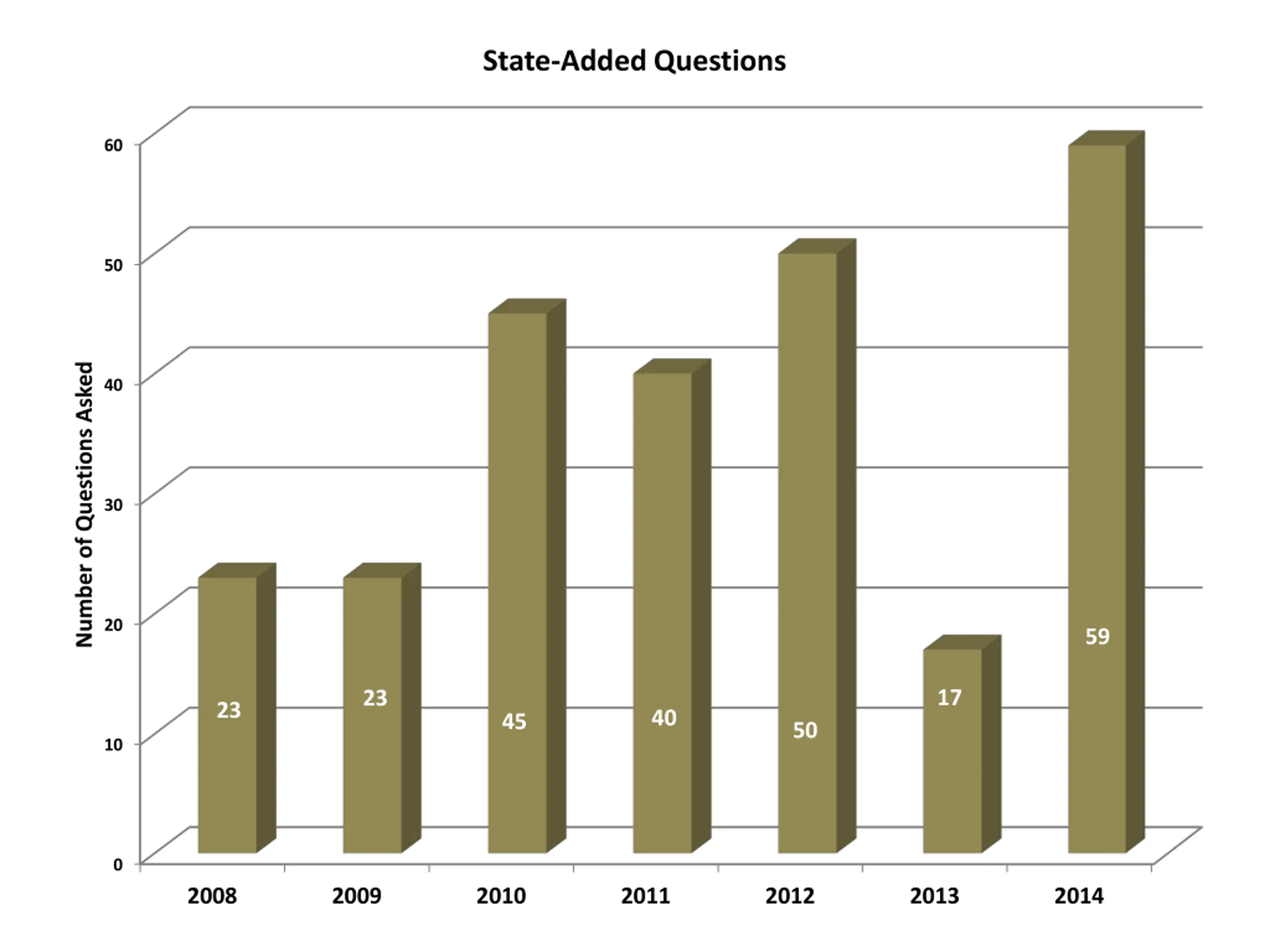 State-Added Questions 60 50 Number of Questions Asked 40 30 20 59 17 23 23 40 45 50 10 0 2008 2009 2010 2011 2012 2013 2014
