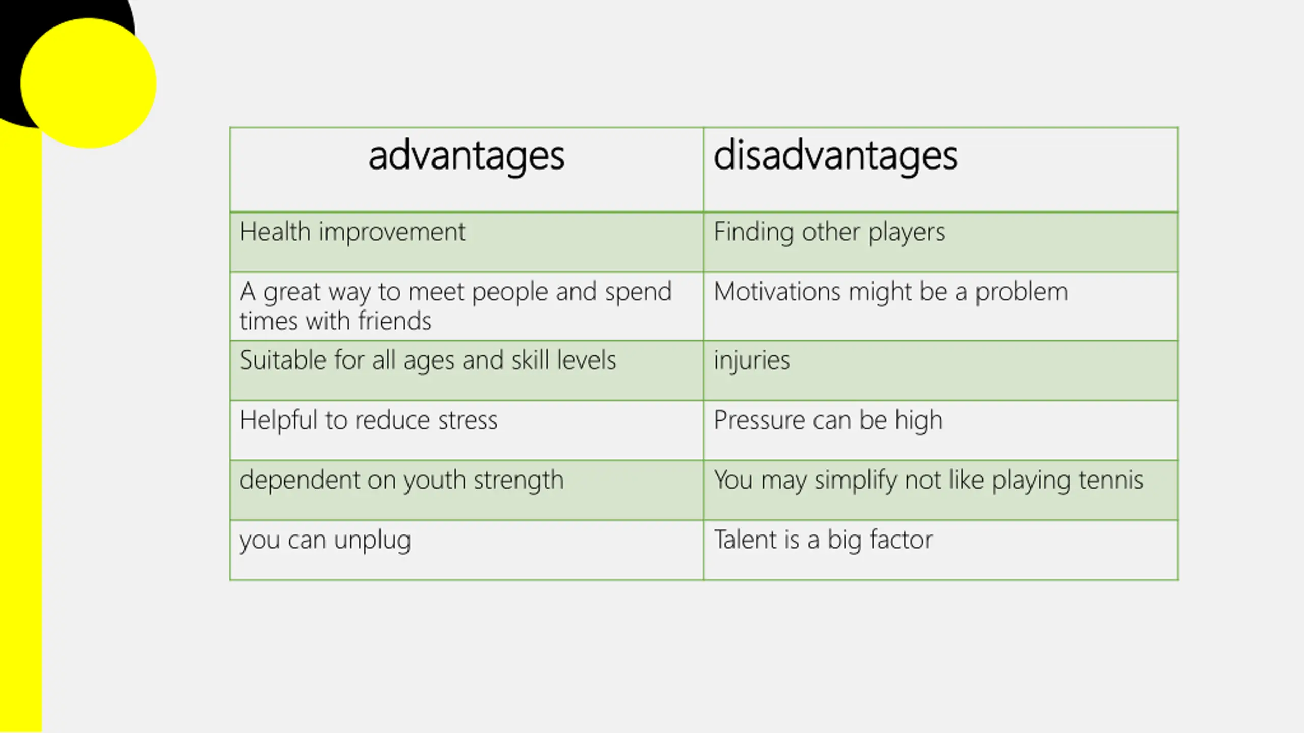 advantages advantages disadvantages disadvantages Health improvement Finding other players A great way to meet people and spend times with friends Suitable for all ages and skill levels Motivations might be a problem injuries Helpful to reduce stress Pressure can be high dependent on youth strength You may simplify not like playing tennis you can unplug Talent is a big factor