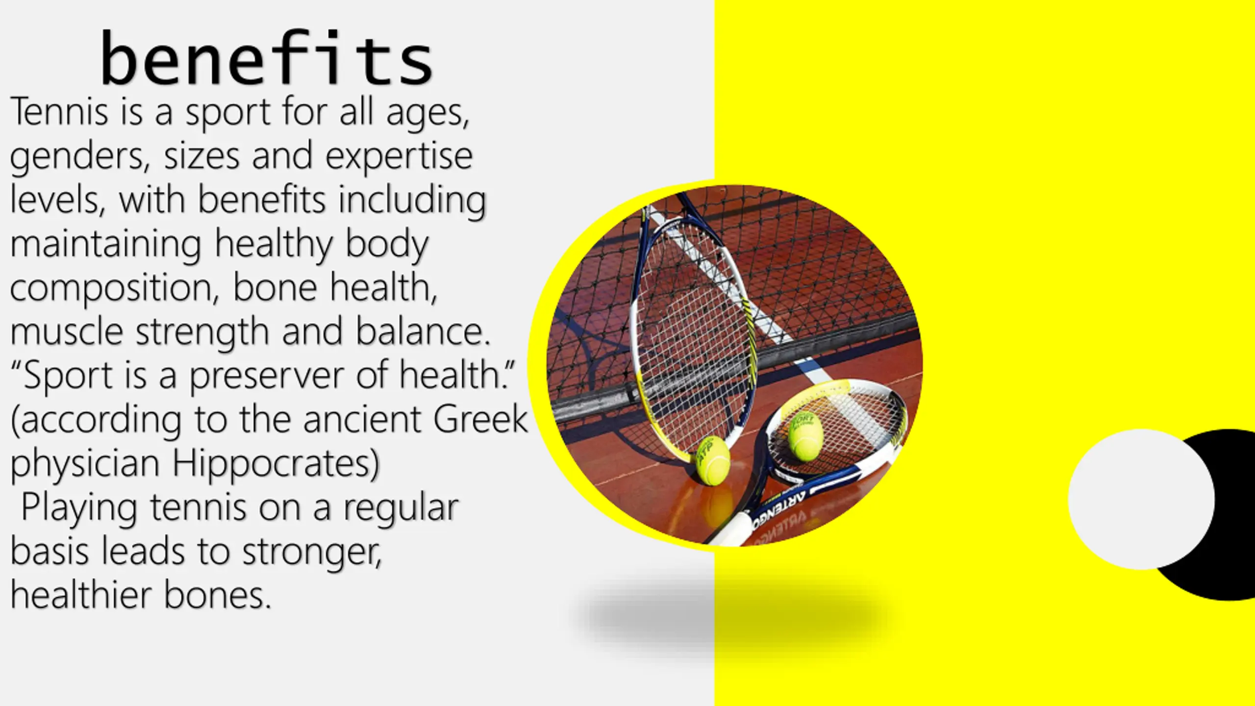 benefits Tennis is a sport for all ages, genders, sizes and expertise levels, with benefits including maintaining healthy body composition, bone health, muscle strength and balance. Sport is a preserver of health. (according to the ancient Greek physician Hippocrates) Playing tennis on a regular basis leads to stronger, healthier bones.