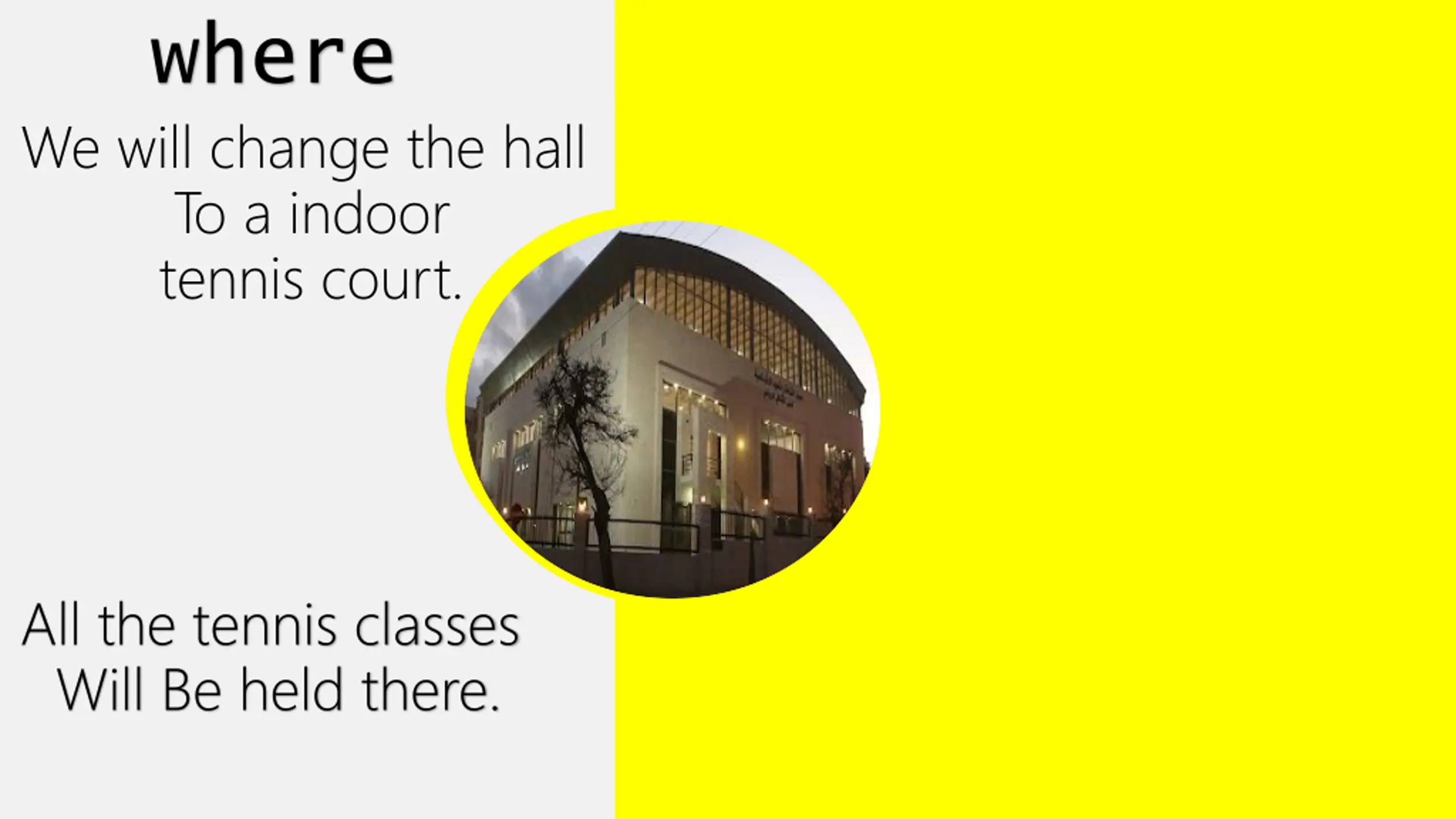 where We will change the hall To a indoor tennis court. All the tennis classes Will Be held there.
