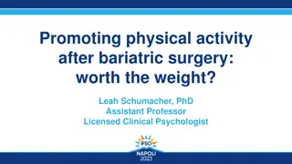 Postoperative Pulmonary Function FEV higher on the first postoperative day after laparoscopic than after open GBP lower rate of segmental atelectasis after laparoscopic GBP Nguyen NT, Lee SL, Goldman C, et al.: Comparison of pulmonary function and postoperative pain after laparoscopic versus open gastric bypass: A randomized trial. J Am Coll Surg 192:469 476, 2001. Postoperative Pulmonary Function FEV1 1 was 38%