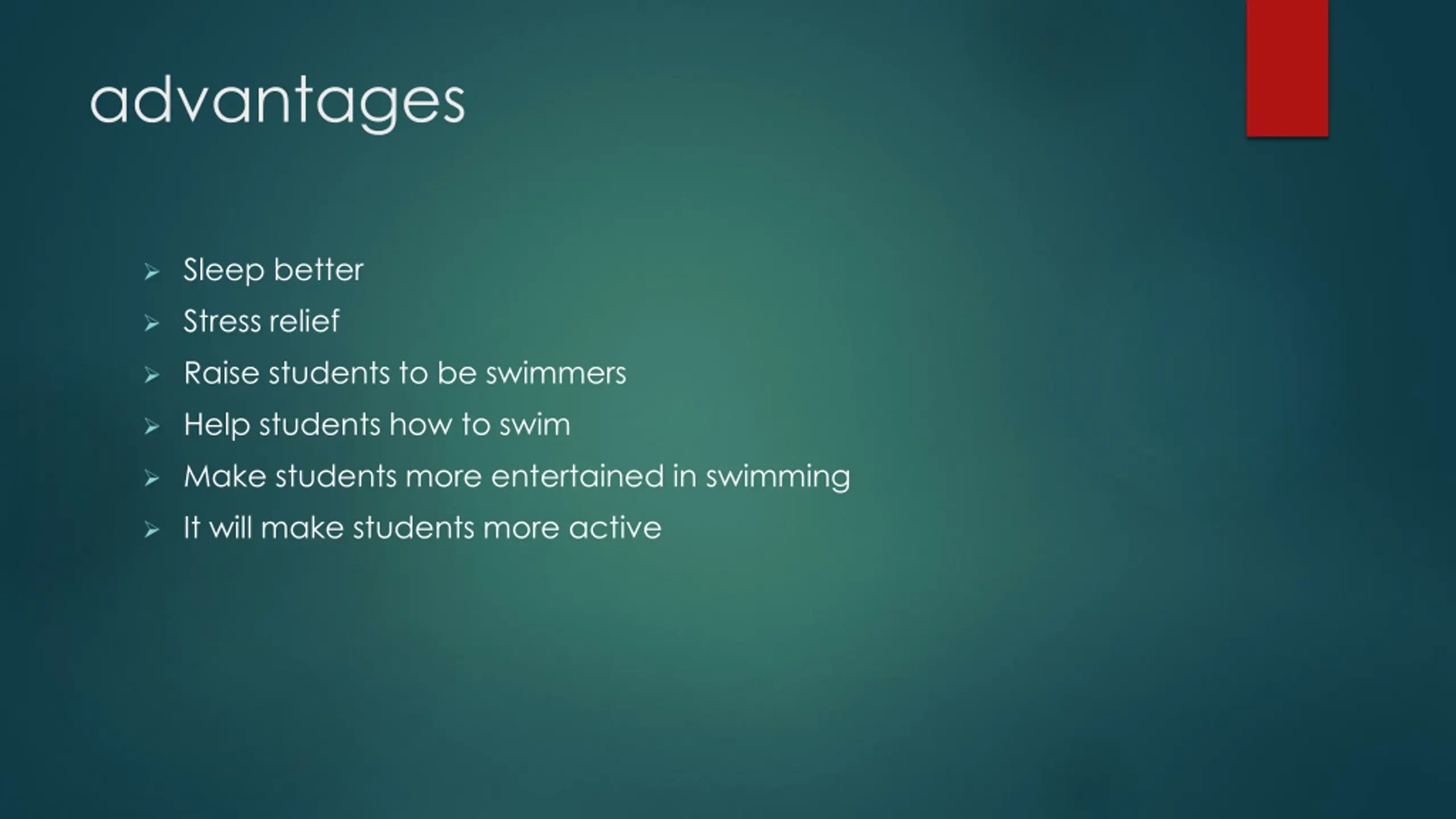 advantages Sleep better Stress relief Raise students to be swimmers Help students how to swim Make students more entertained in swimming It will make students more active