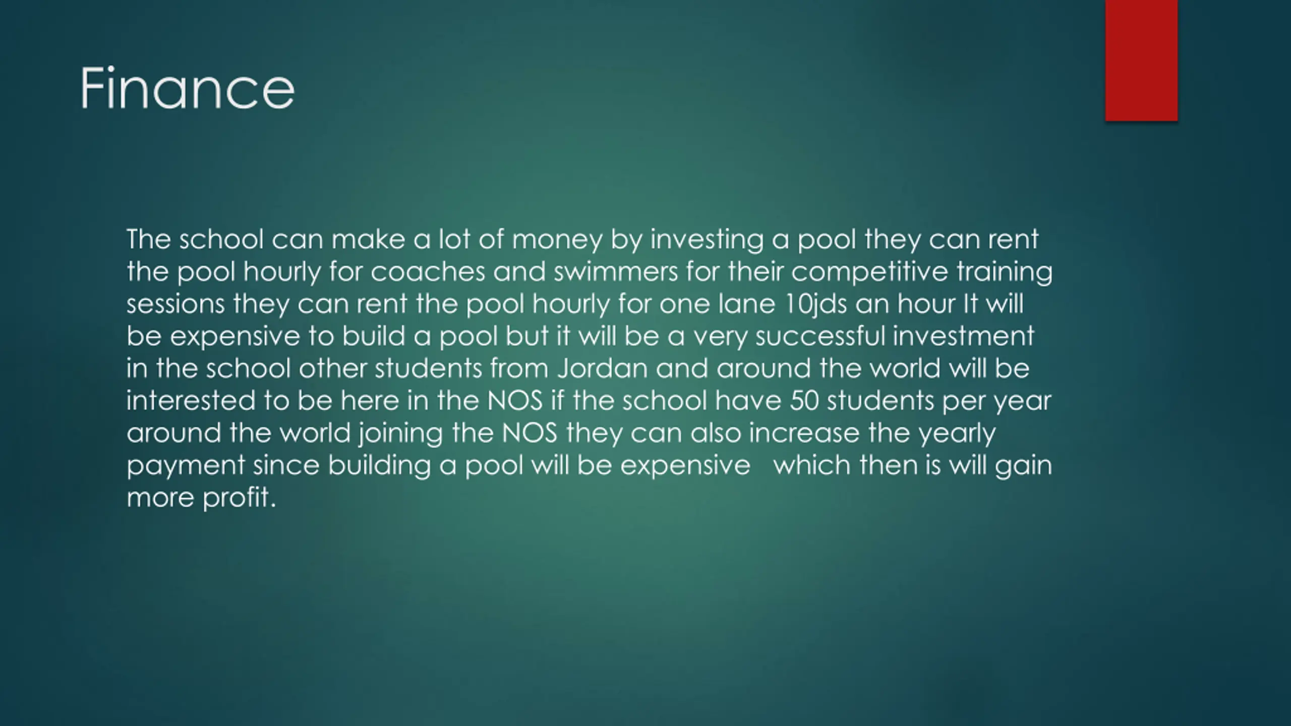Finance The school can make a lot of money by investing a pool they can rent the pool hourly for coaches and swimmers for their competitive training sessions they can rent the pool hourly for one lane 10jds an hour It will be expensive to build a pool but it will be a very successful investment in the school other students from Jordan and around the world will be interested to be here in the NOS if the school have 50 students per year around the world joining the NOS they can also increase the yearly payment since building a pool will be expensive which then is will gain more profit.