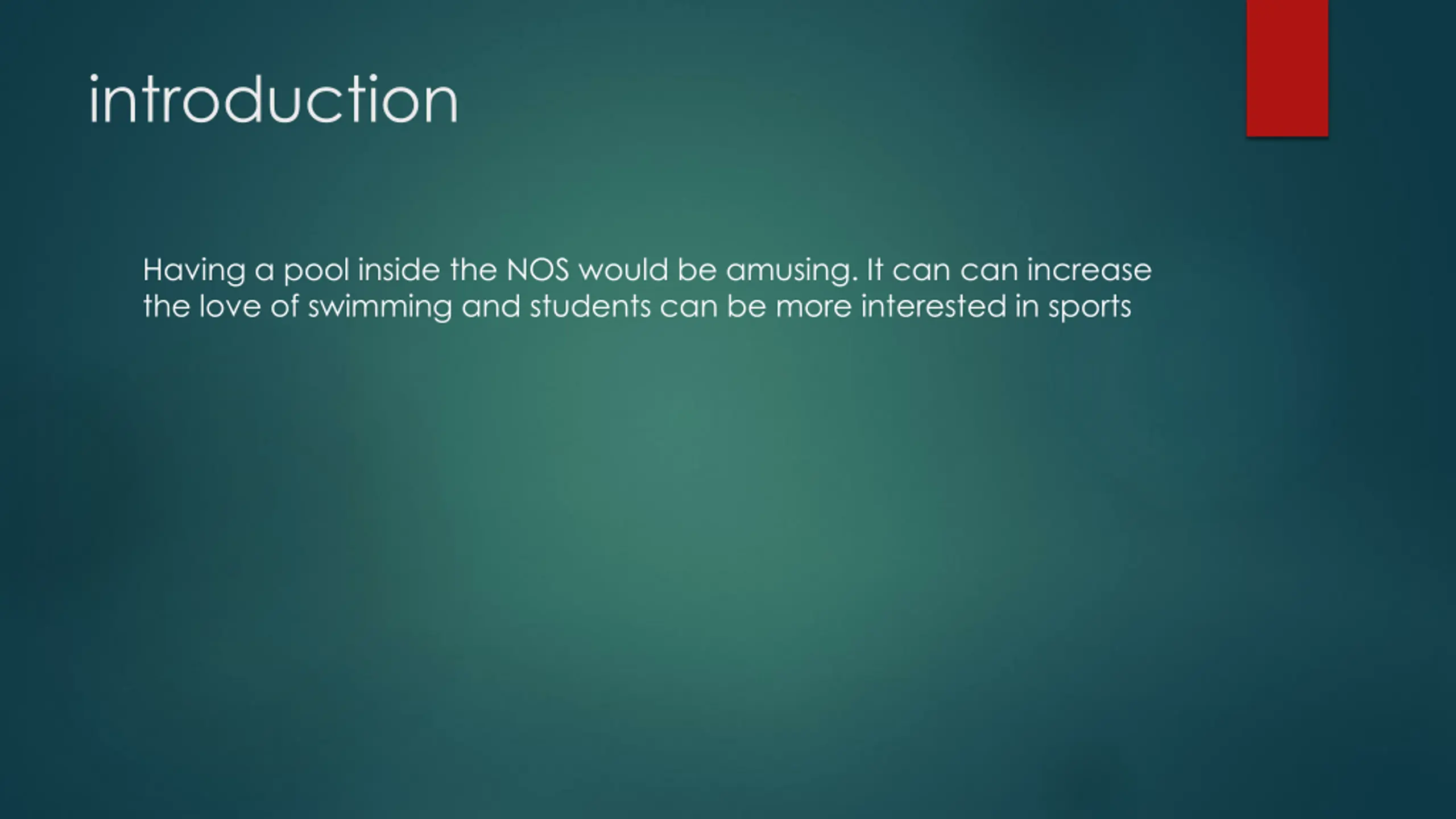 introduction Having a pool inside the NOS would be amusing. It can can increase the love of swimming and students can be more interested in sports