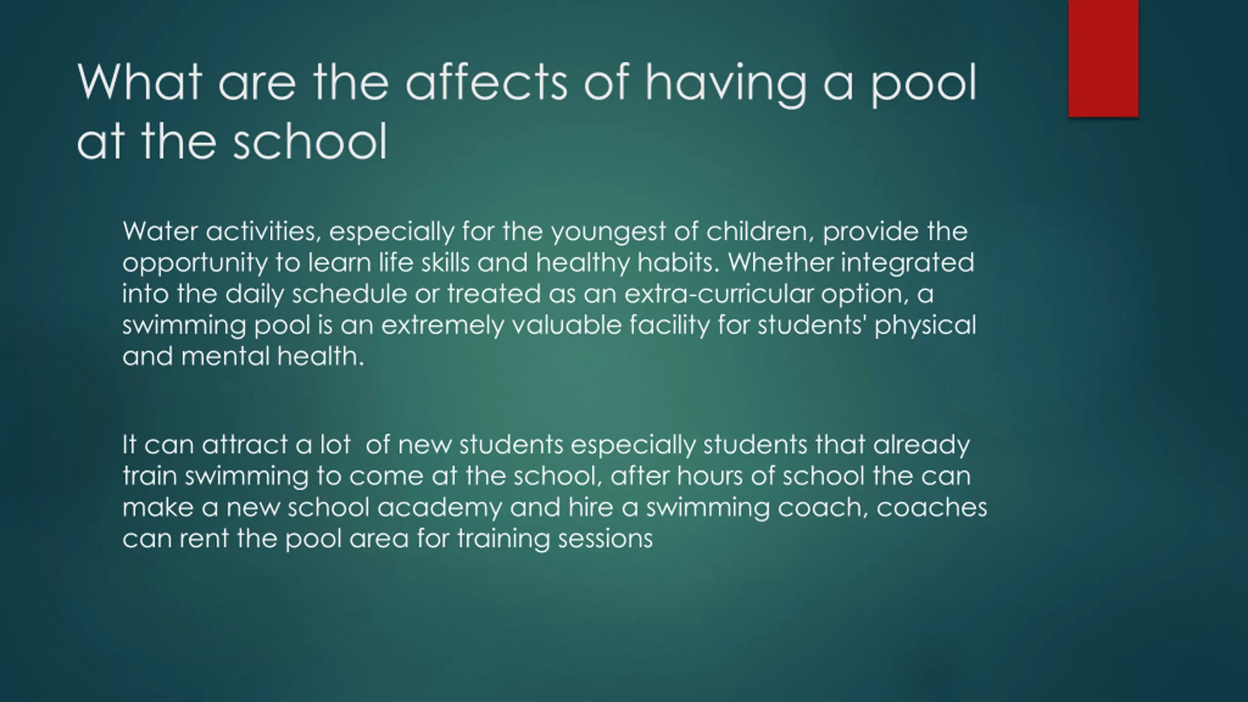 What are the affects of having a pool at the school Water activities, especially for the youngest of children, provide the opportunity to learn life skills and healthy habits. Whether integrated into the daily schedule or treated as an extra-curricular option, a swimming pool is an extremely valuable facility for students' physical and mental health. It can attract a lot of new students especially students that already train swimming to come at the school, after hours of school the can make a new school academy and hire a swimming coach, coaches can rent the pool area for training sessions
