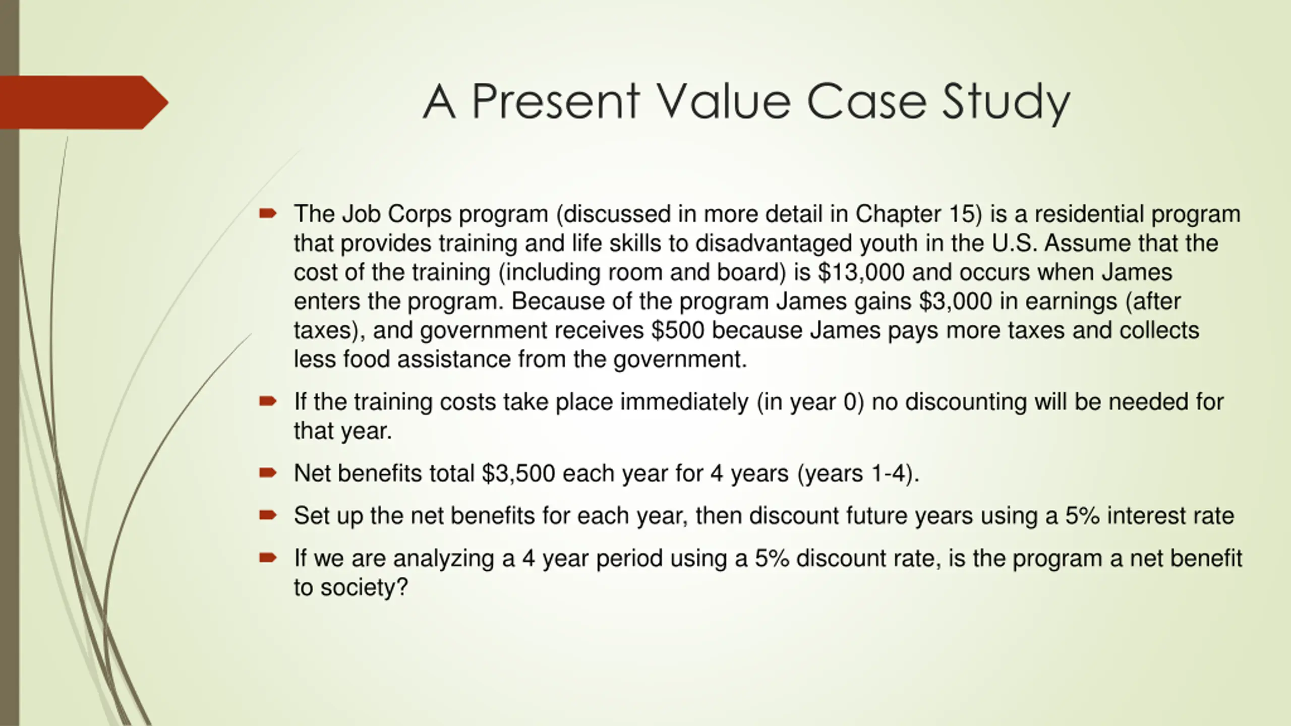 A Present Value Case Study The Job Corps program (discussed in more detail in Chapter 15) is a residential program that provides training and life skills to disadvantaged youth in the U.S. Assume that the cost of the training (including room and board) is $13,000 and occurs when James enters the program. Because of the program James gains $3,000 in earnings (after taxes), and government receives $500 because James pays more taxes and collects less food assistance from the government. If the training costs take place immediately (in year 0) no discounting will be needed for that year. Net benefits total $3,500 each year for 4 years (years 1-4). Set up the net benefits for each year, then discount future years using a 5% interest rate If we are analyzing a 4 year period using a 5% discount rate, is the program a net benefit to society?