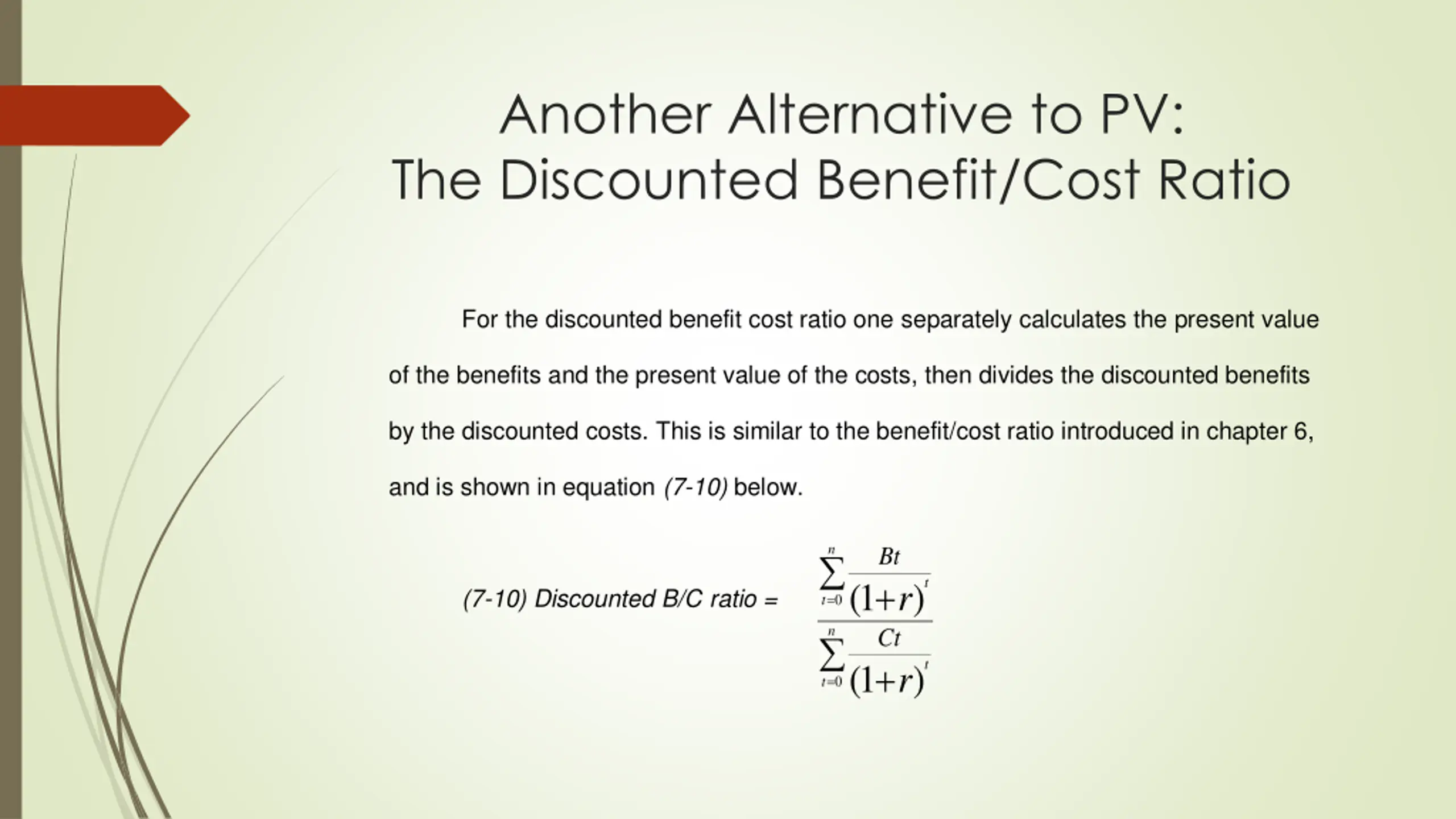 Another Alternative to PV: The Discounted Benefit/Cost Ratio For the discounted benefit cost ratio one separately calculates the present value of the benefits and the present value of the costs, then divides the discounted benefits by the discounted costs. This is similar to the benefit/cost ratio introduced in chapter 6, and is shown in equation (7-10) below. n Bt = t + Ct t 1 ( ) r (7-10) Discounted B/Cratio = 0 n = t + t 1 ( ) r 0