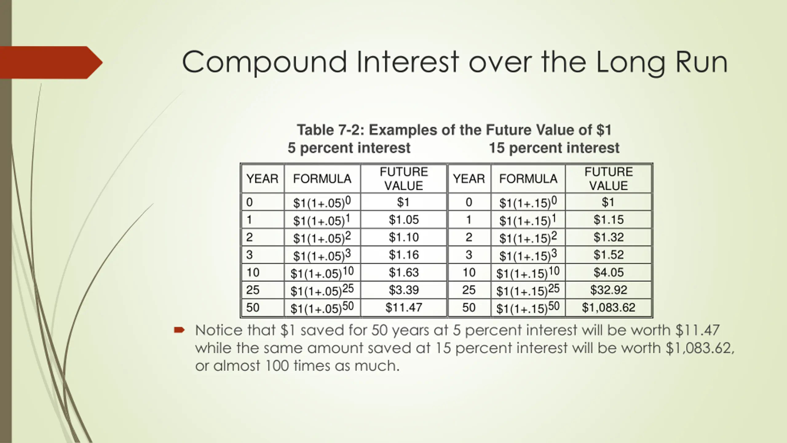 Compound Interest over the Long Run Table 7-2: Examples of the Future Value of $1 5 percent interest 15 percent interest FUTURE VALUE $1 $1.05 $1.10 $1.16 $1.63 $3.39 $11.47 FUTURE VALUE $1 $1.15 $1.32 $1.52 $4.05 $32.92 $1,083.62 YEAR FORMULA YEAR FORMULA $1(1+.05)0 $1(1+.05)1 $1(1+.05)2 $1(1+.05)3 $1(1+.05)10 $1(1+.05)25 $1(1+.05)50 $1(1+.15)0 $1(1+.15)1 $1(1+.15)2 $1(1+.15)3 $1(1+.15)10 $1(1+.15)25 $1(1+.15)50 0 1 2 3 10 25 50 0 1 2 3 10 25 50 Notice that $1 saved for 50 years at 5 percent interest will be worth $11.47 while the same amount saved at 15 percent interest will be worth $1,083.62, or almost 100 times as much.