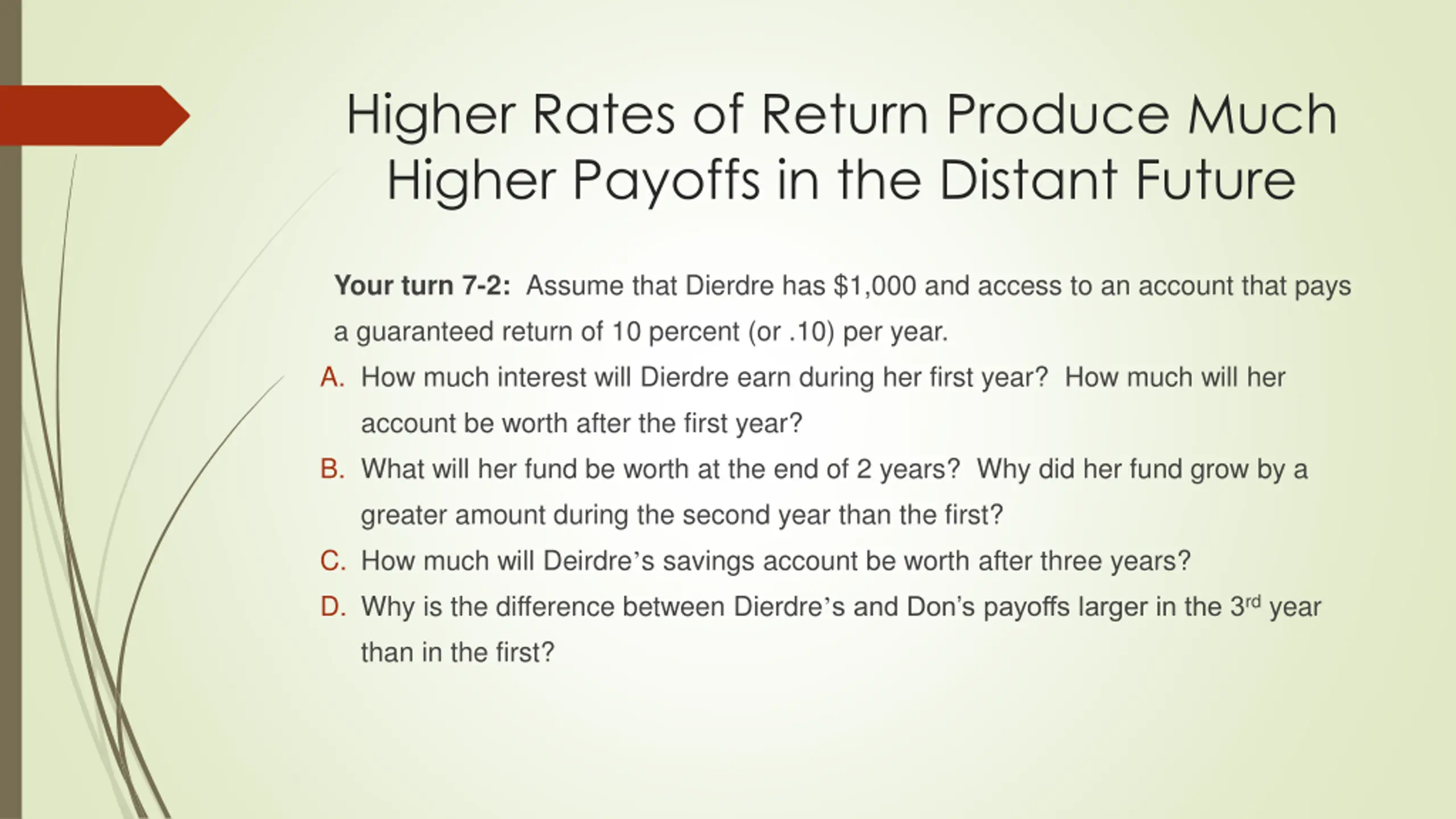 Higher Rates of Return Produce Much Higher Payoffs in the Distant Future Your turn 7-2: Assume that Dierdre has $1,000 and access to an account that pays a guaranteed return of 10 percent (or .10) per year. A. How much interest will Dierdre earn during her first year? How much will her account be worth after the first year? B. What will her fund be worth at the end of 2 years? Why did her fund grow by a greater amount during the second year than the first? C. How much will Deirdre s savings account be worth after three years? D. Why is the difference between Dierdre s and Don s payoffs larger in the 3rdyear than in the first?