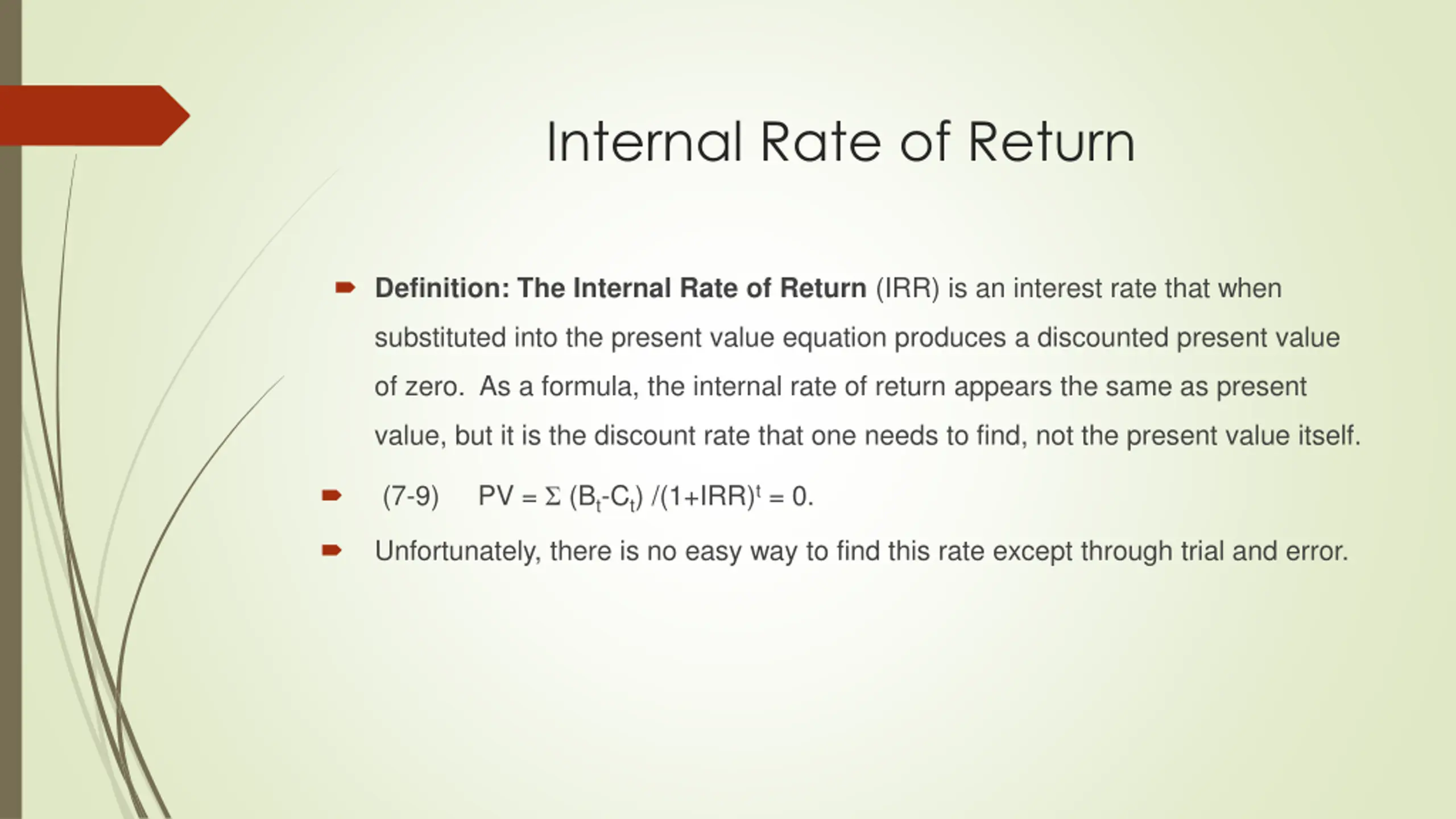Internal Rate of Return Definition: The Internal Rate of Return (IRR) is an interest rate that when substituted into the present value equation produces a discounted present value of zero. As a formula, the internal rate of return appears the same as present value, but it is the discount rate that one needs to find, not the present value itself. (7-9) PV = (Bt-Ct) /(1+IRR)t= 0. Unfortunately, there is no easy way to find this rate except through trial and error.