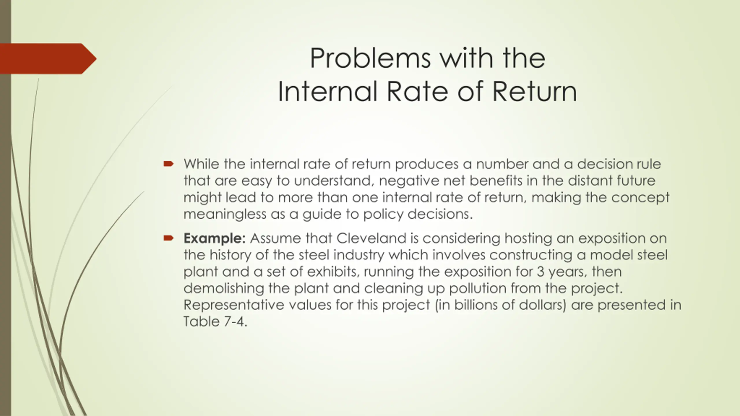 Problems with the Internal Rate of Return While the internal rate of return produces a number and a decision rule that are easy to understand, negative net benefits in the distant future might lead to more than one internal rate of return, making the concept meaningless as a guide to policy decisions. Example: Assume that Cleveland is considering hosting an exposition on the history of the steel industry which involves constructing a model steel plant and a set of exhibits, running the exposition for 3 years, then demolishing the plant and cleaning up pollution from the project. Representative values for this project (in billions of dollars) are presented in Table 7-4.
