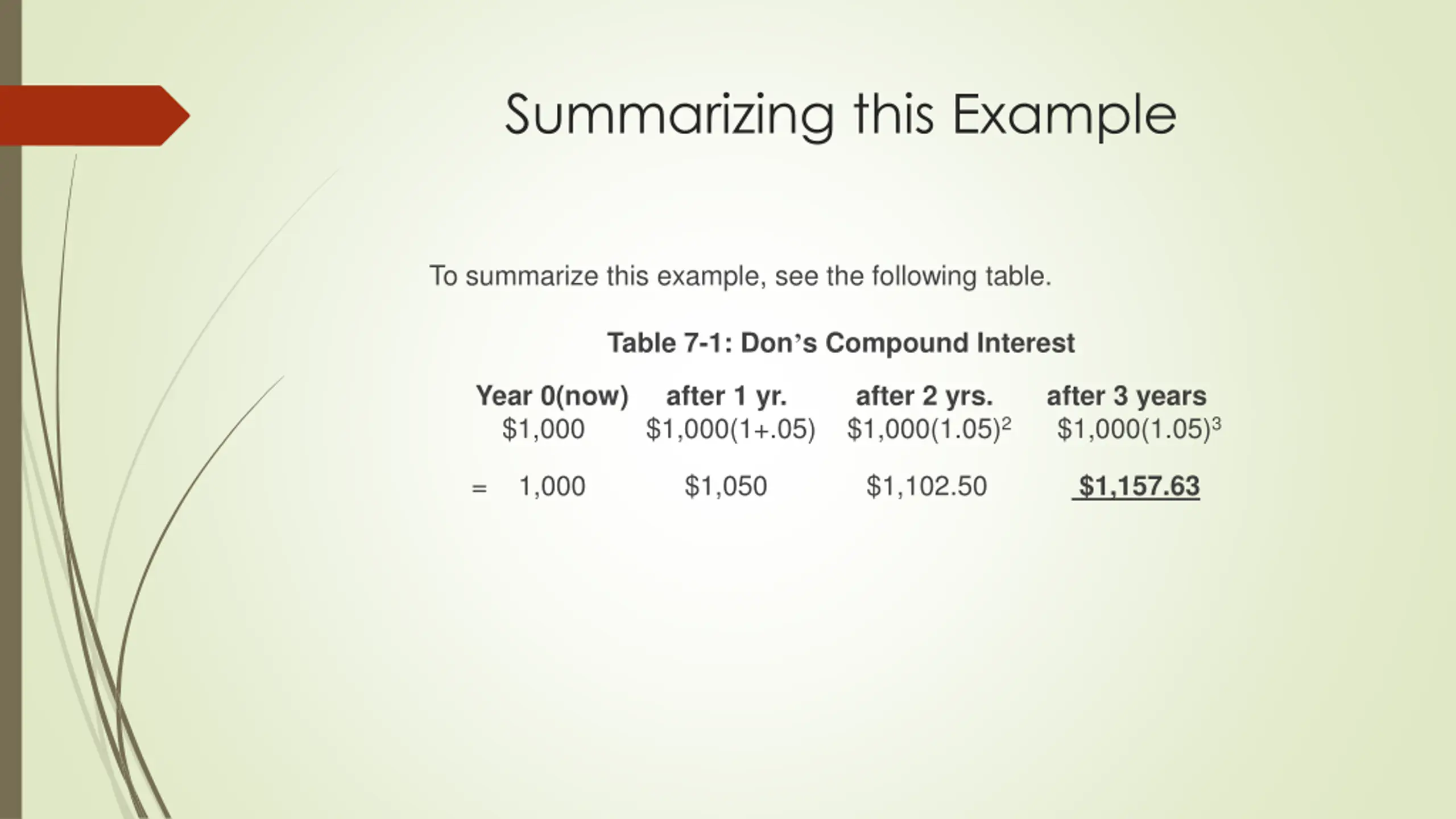Summarizing this Example To summarize this example, see the following table. Table 7-1: Don s Compound Interest Year 0(now) after 1 yr. after 2 yrs. after 3 years $1,000 $1,000(1+.05) $1,000(1.05)2 $1,000(1.05)3 = 1,000 $1,050 $1,102.50 $1,157.63