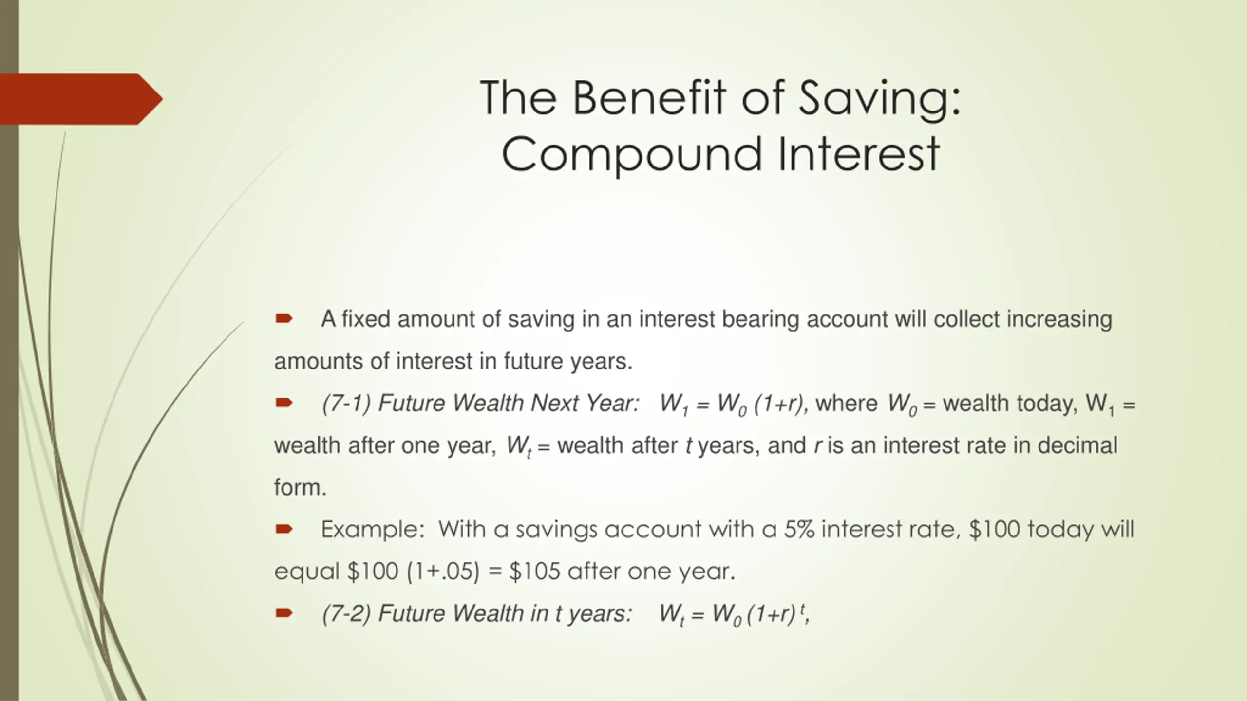 The Benefit of Saving: Compound Interest A fixed amount of saving in an interest bearing account will collect increasing amounts of interest in future years. (7-1) Future Wealth Next Year: W1= W0(1+r), where W0= wealth today, W1= wealth after one year, Wt= wealth after t years, and r is an interest rate in decimal form. Example: With a savings account with a 5% interest rate, $100 today will equal $100 (1+.05) = $105 after one year. (7-2) Future Wealth in t years: Wt= W0 (1+r)t,