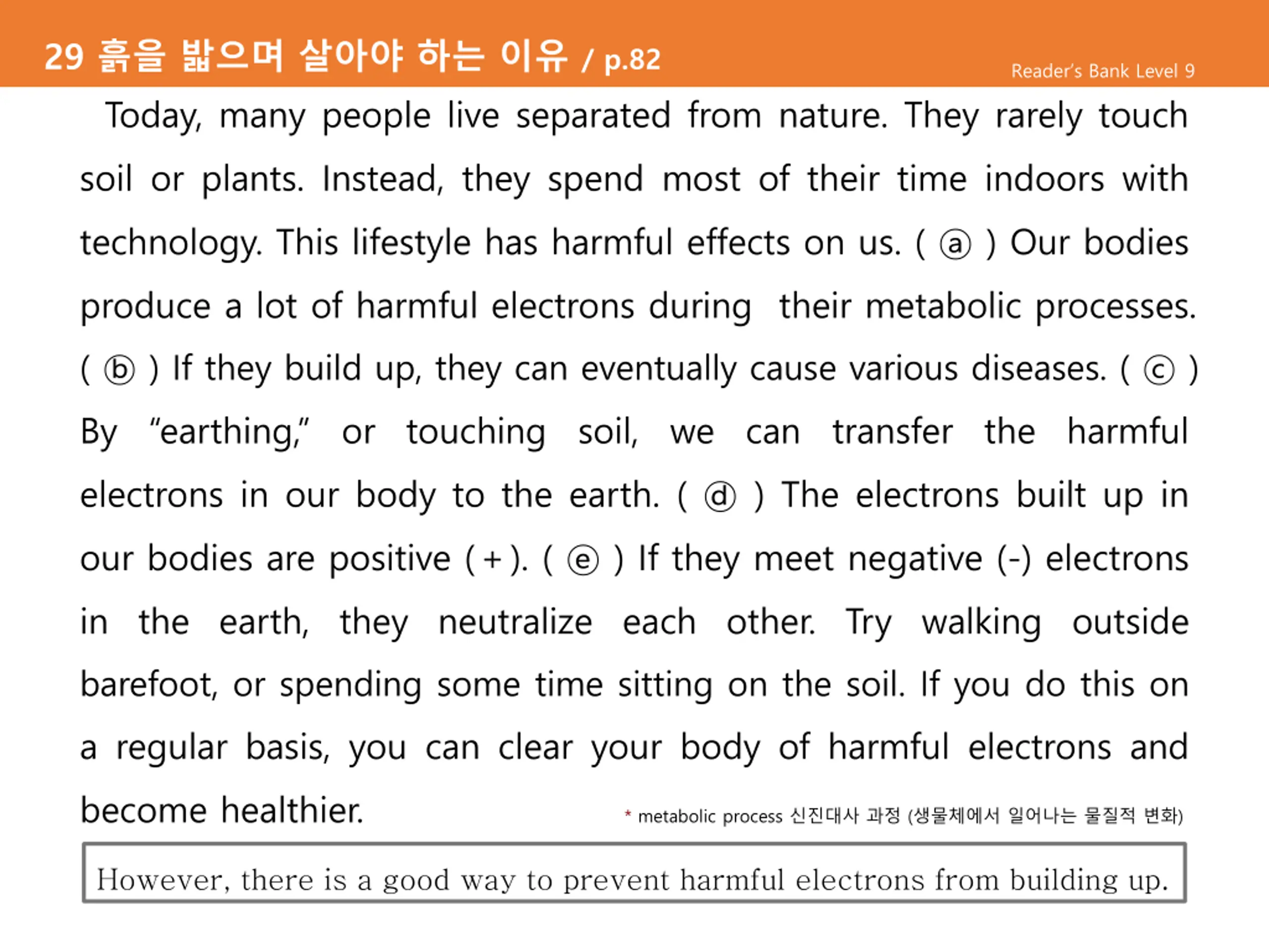 29 / p.82 Today, many people live separated from nature. They rarely touch soil or plants. Instead, they spend most of their time indoors with technology. This lifestyle has harmful effects on us. ( ) Our bodies produce a lot of harmful electrons during their metabolic processes. ( ) If they build up, they can eventually cause various diseases. ( ) By earthing, or touching soil, we can transfer the harmful electrons in our body to the earth. ( ) The electrons built up in our bodies are positive ( ). ( ) If they meet negative (-) electrons in the earth, they neutralize each other. Try walking outside barefoot, or spending some time sitting on the soil. If you do this on a regular basis, you can clear your body of harmful electrons and become healthier. Reader s Bank Level 9 * metabolic process ( ) However, there is a good way to prevent harmful electrons from building up.