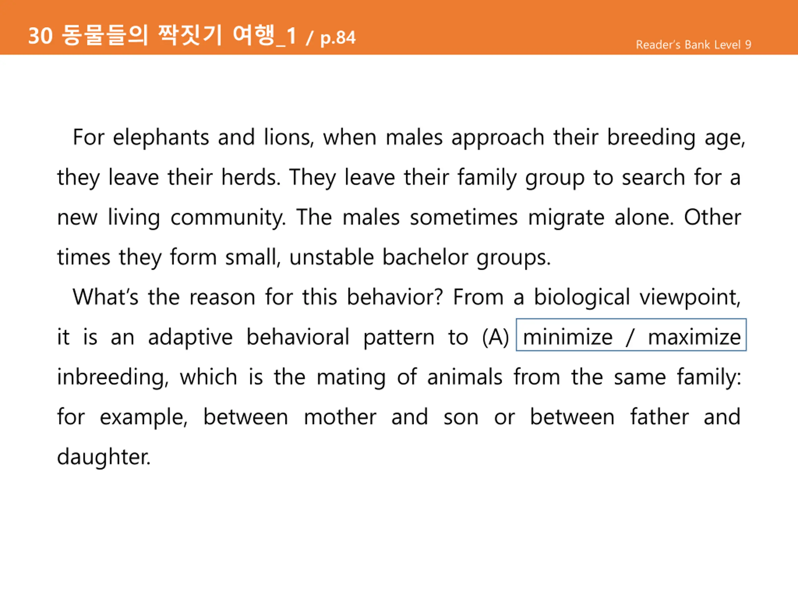 30 _1 / p.84 Reader s Bank Level 9 For elephants and lions, when males approach their breeding age, they leave their herds. They leave their family group to search for a new living community. The males sometimes migrate alone. Other times they form small, unstable bachelor groups. What s the reason for this behavior? From a biological viewpoint, it is an adaptive behavioral pattern to (A) minimize / maximize inbreeding, which is the mating of animals from the same family: for example, between mother and son or between father and daughter.