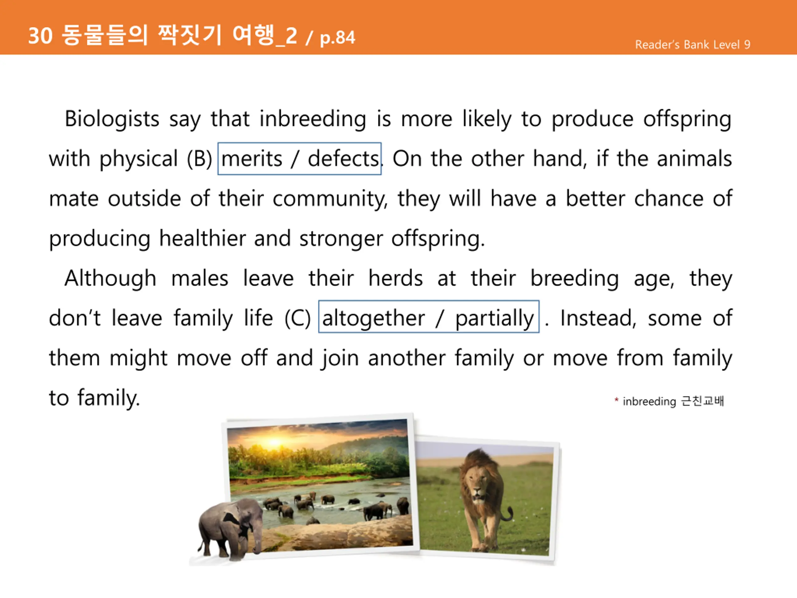 30 _2 / p.84 Reader s Bank Level 9 Biologists say that inbreeding is more likely to produce offspring with physical (B) merits / defects. On the other hand, if the animals mate outside of their community, they will have a better chance of producing healthier and stronger offspring. Although males leave their herds at their breeding age, they don t leave family life (C) altogether / partially . Instead, some of them might move off and join another family or move from family to family. * inbreeding